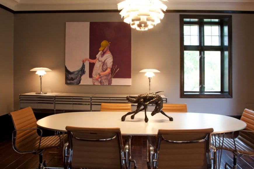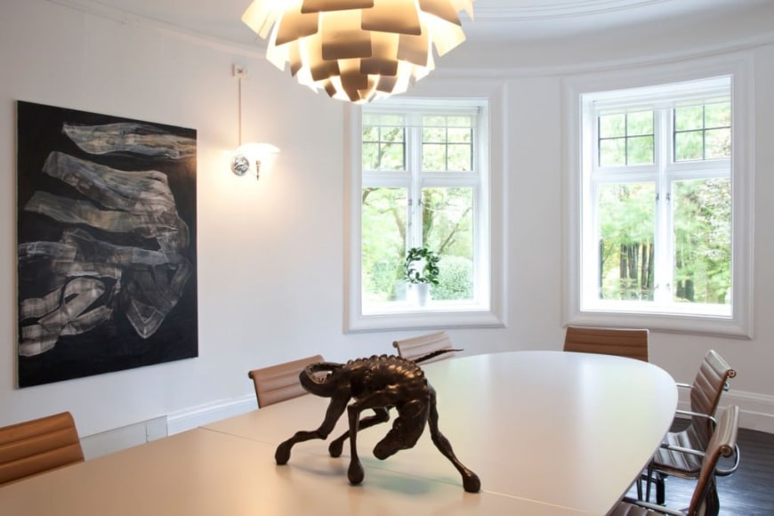 The villa based office Challenge House 107 is located in a beautiful and natural environment on Eiganes in Stavanger. The office is in use when negotiations, strategy meetings and board meetings requires calm and soothing circumstances. In evolving a sketch for the commissioned artwork for the office, the most significant element was to enhance the soul of the building. The villa dates back to the beginning of the twentieth century, and has a typical Scandinavian architectural structure and appearance. To enhance this element the consultants of BGE Contemporary Art Projects focused on the great masters of Norwegian and Scandinavian painting. One of them is Inger Sitter, renowned for being the first Norwegian female modernists, using an abstract visual language with vivid brushstrokes and bold choices of color. She has a unique personal idiom through her 60 years of reinvention. Of the chosen artists is Håkon Bleken, who has been one of the most prominent Norwegian artists over the last forty years alongside Sitter. He has been a vast influence on the Norwegian contemporary art scene, and is considered a national master. His works has a wide range of expressions, from carefully composed pieces to intelligent simplicity. The other artworks represented are from Sverre Bjertnæs, Per Maning and Michael Kvium.