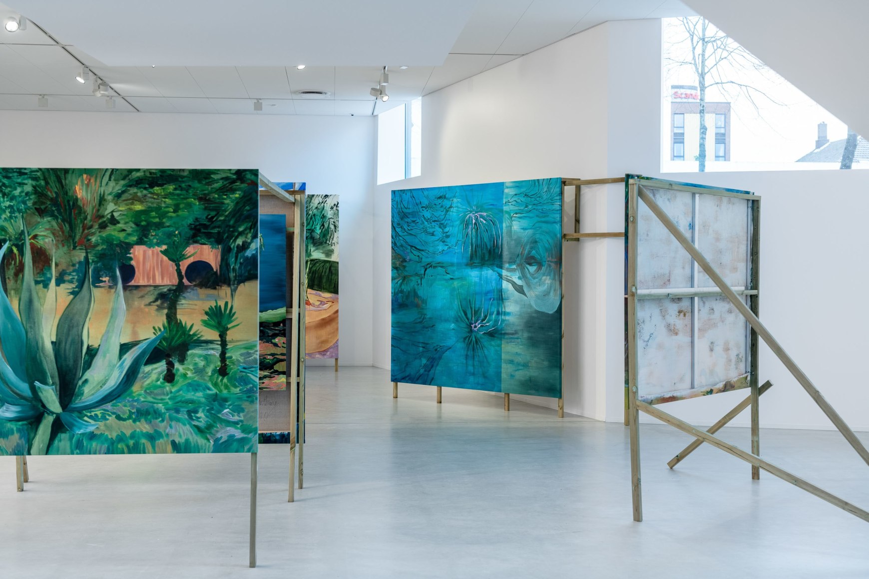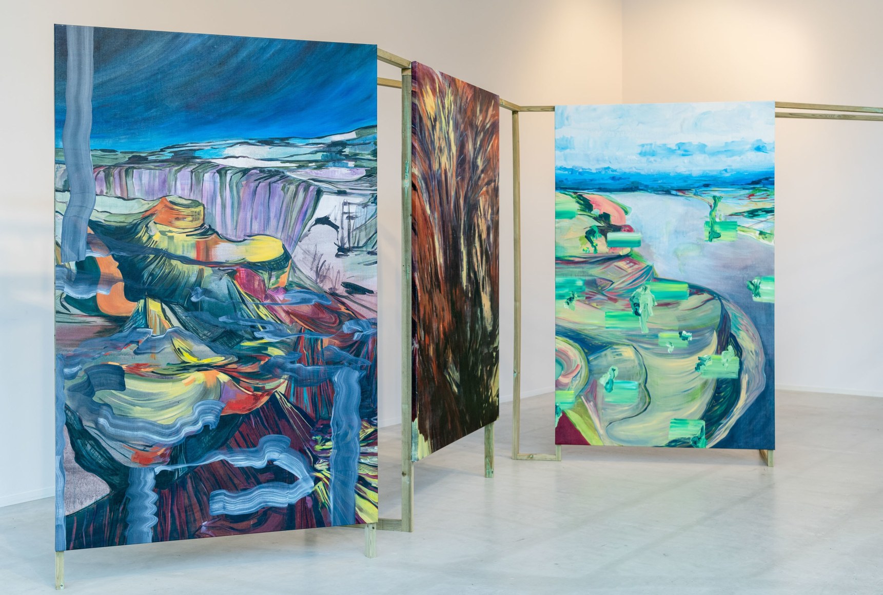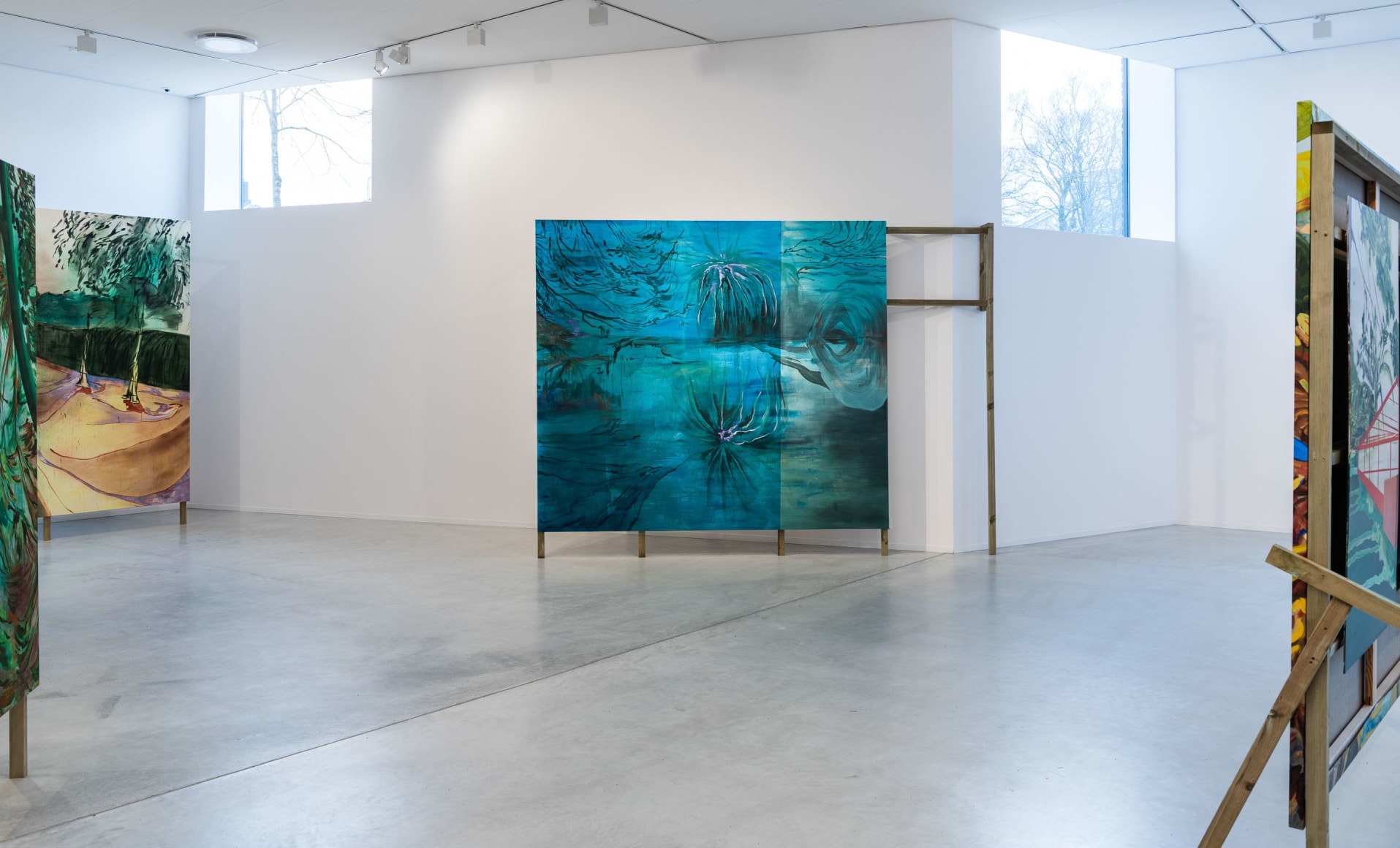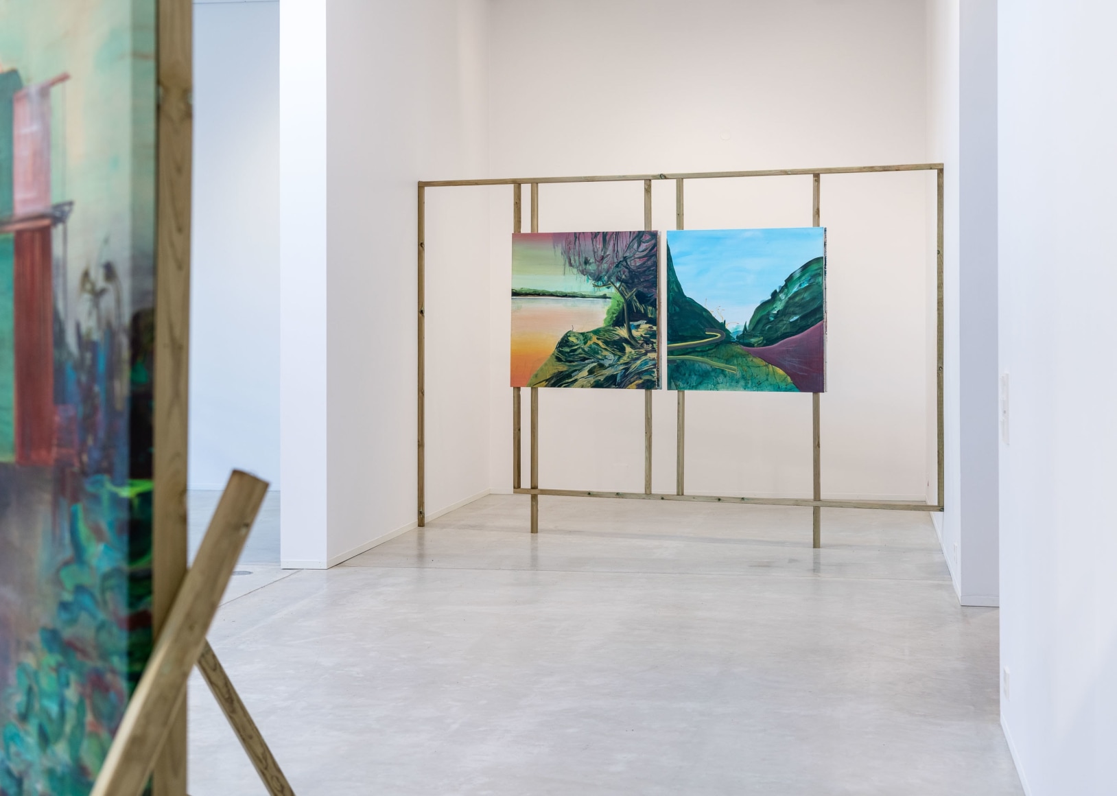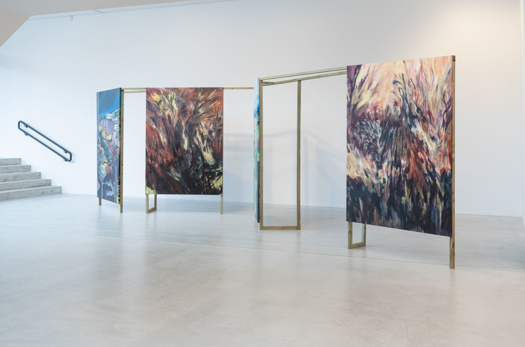 I always work on several paintings at the same time. When paintings are made like this, they are born in dialogue with one another. Relations are drawn. Although not always visible, I believe they are still felt. Each painting works by itself and can stand alone, but together they are thought up as part of a whole. This holistic space carries with it atmospheres, narratives, relationships. They make up an environment, which potentially leaves imprints. In the final scenography of the exhibition, a material framework is thought out in relation to the given architectural space. These material constructions become the skeleton that holds the paintings together.