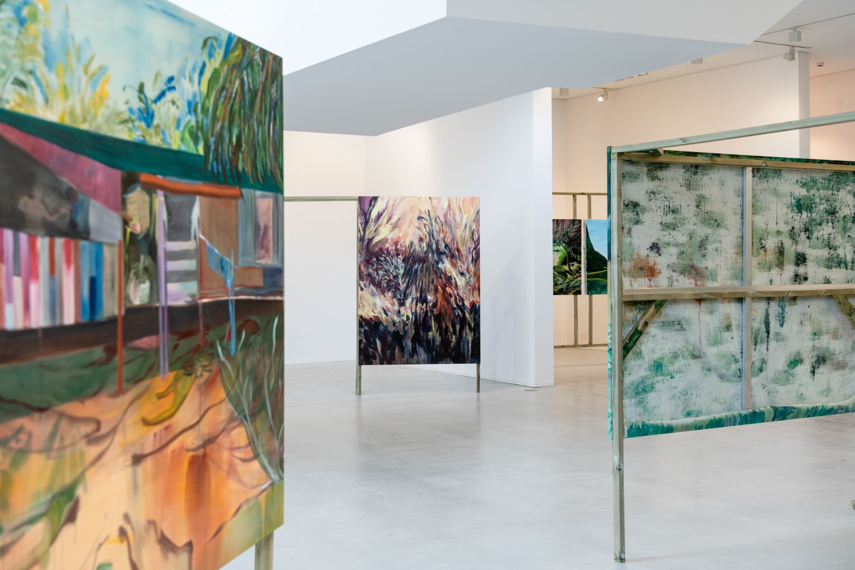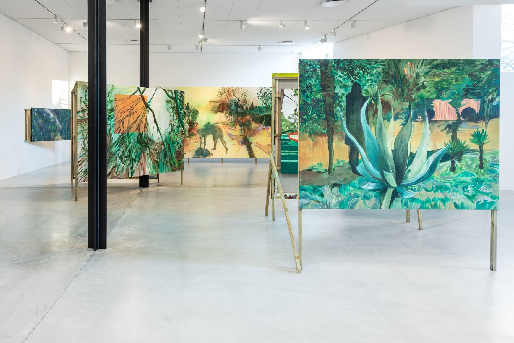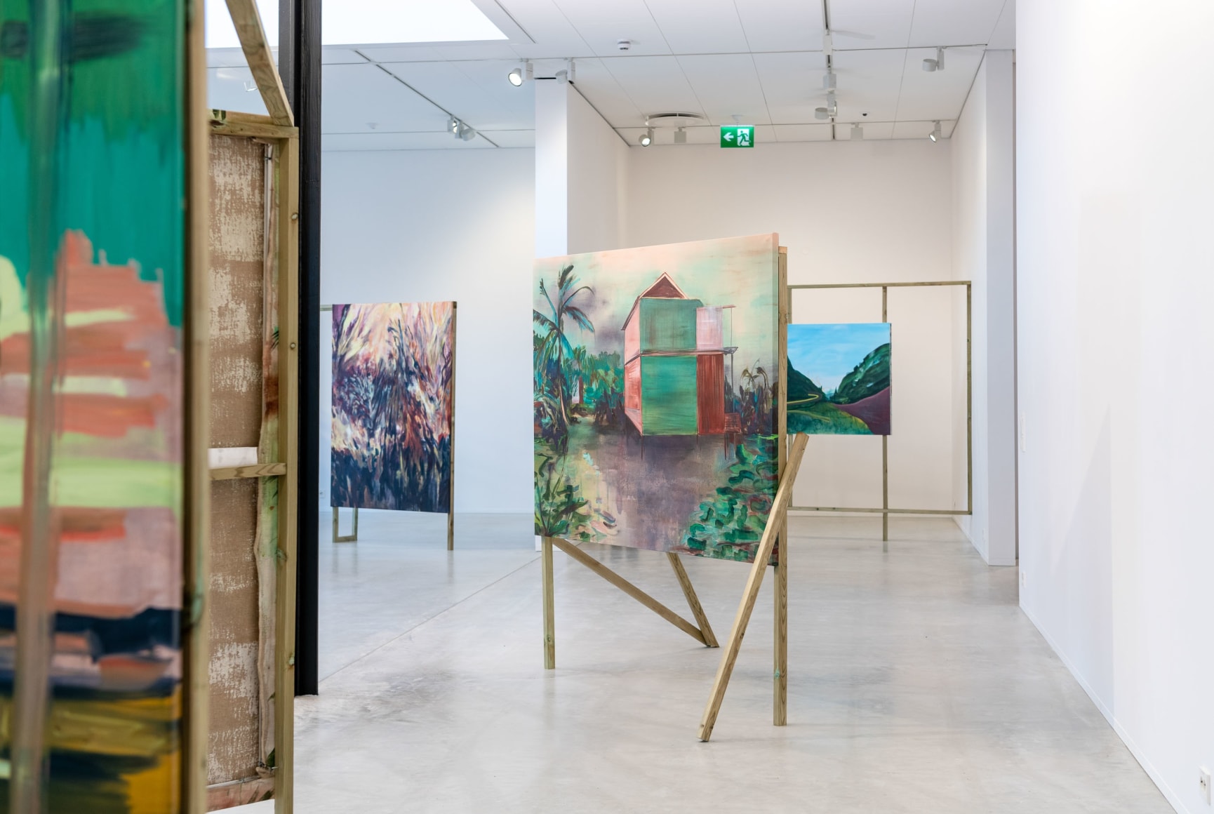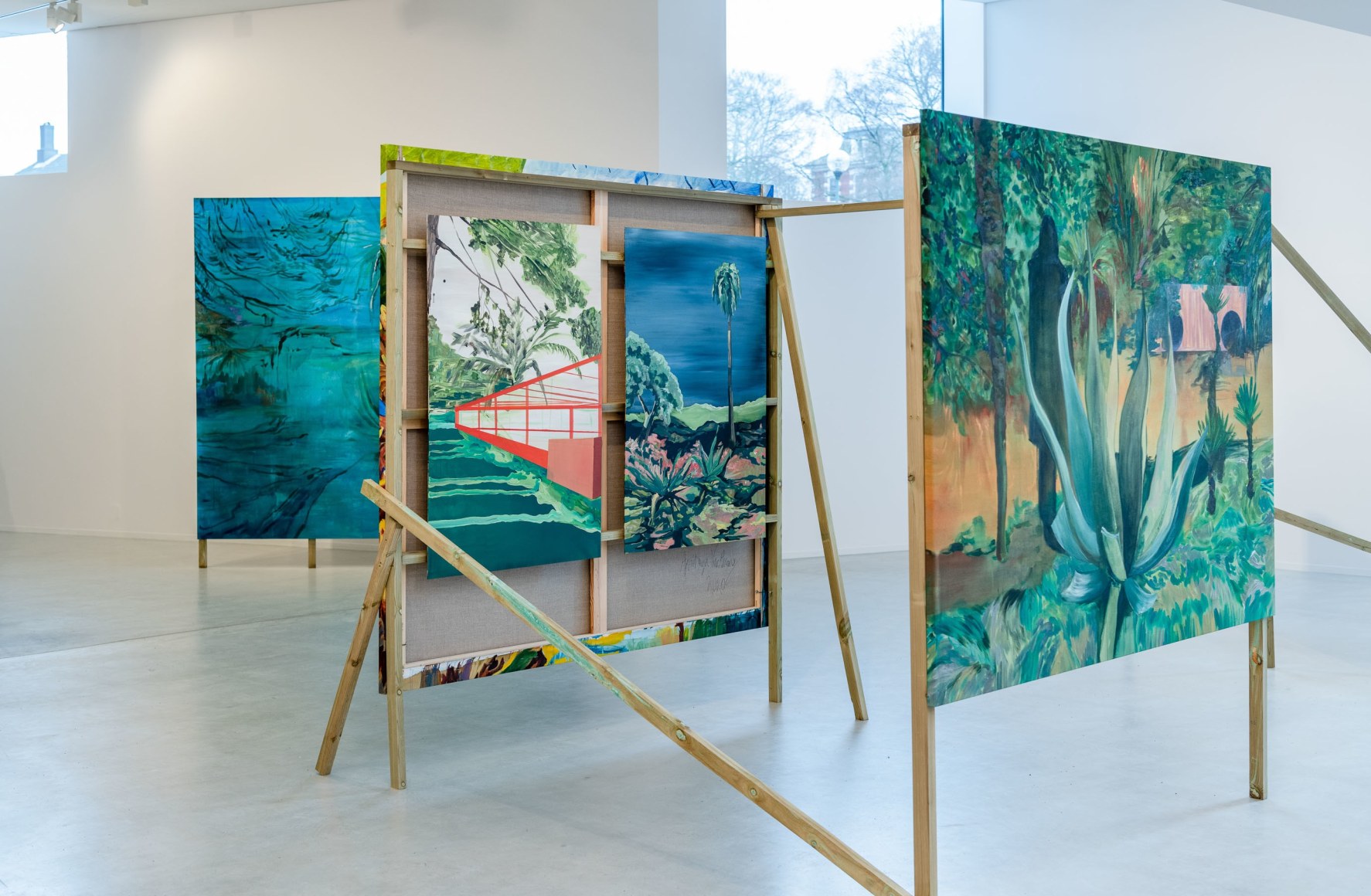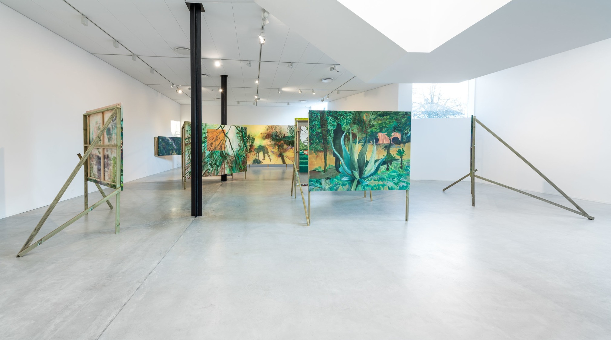 I always work on several paintings at the same time. When paintings are made like this, they are born in dialogue with one another. Relations are drawn. Although not always visible, I believe they are still felt. Each painting works by itself and can stand alone, but together they are thought up as part of a whole. This holistic space carries with it atmospheres, narratives, relationships. They make up an environment, which potentially leaves imprints. In the final scenography of the exhibition, a material framework is thought out in relation to the given architectural space. These material constructions become the skeleton that holds the paintings together.