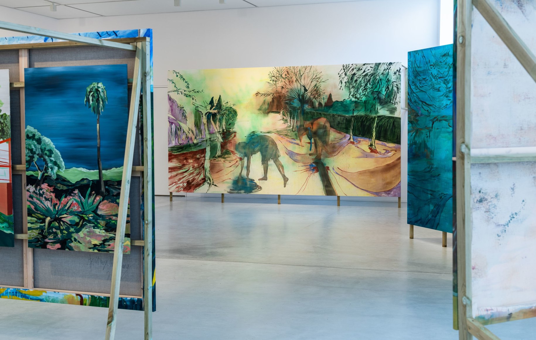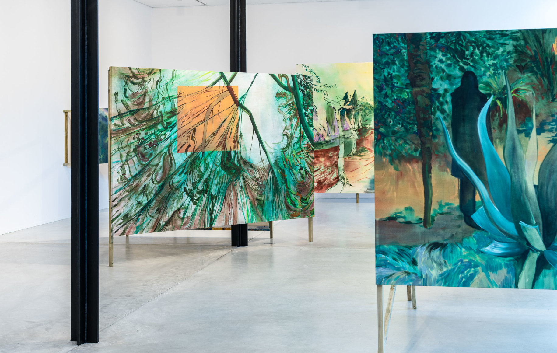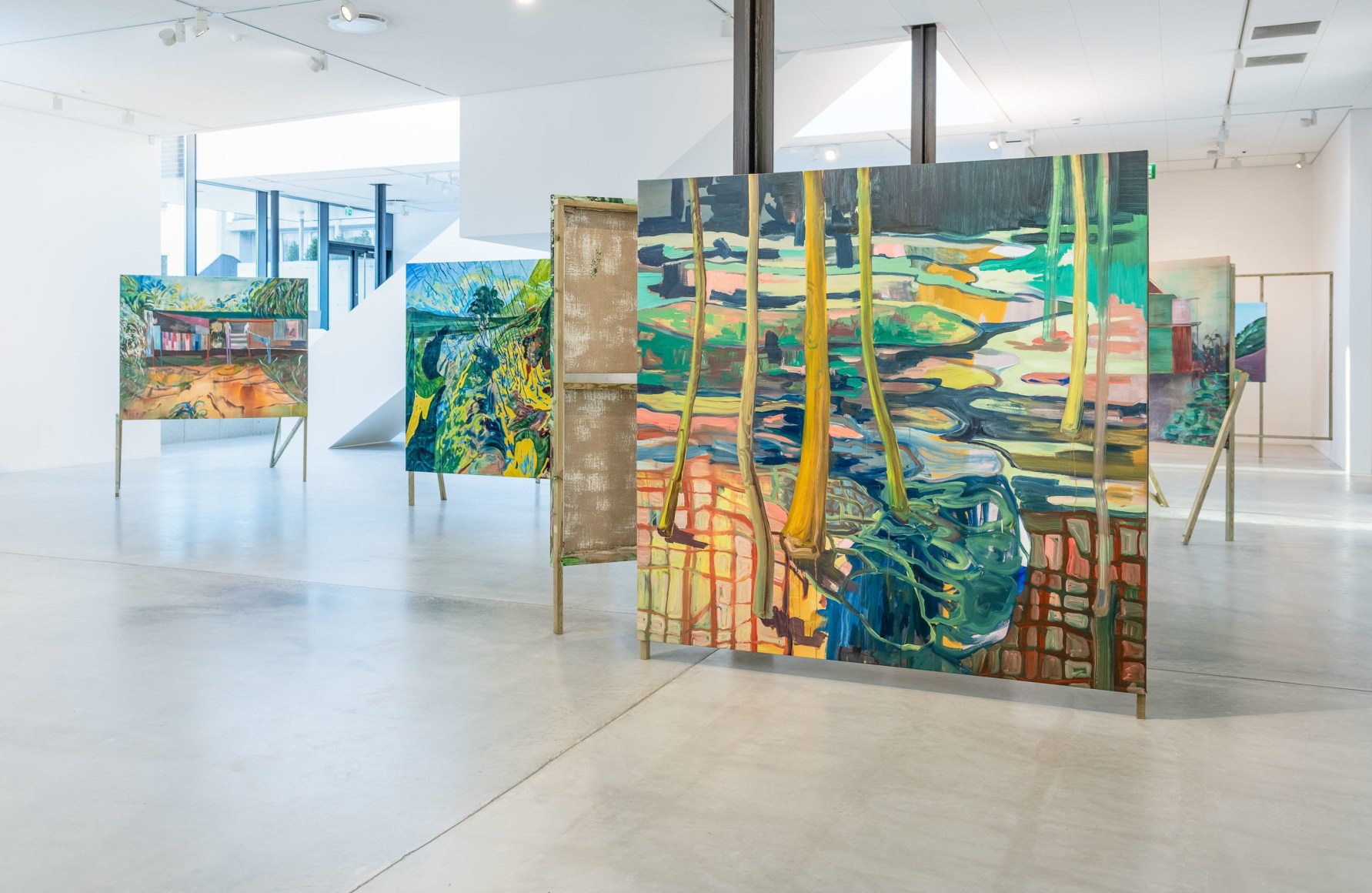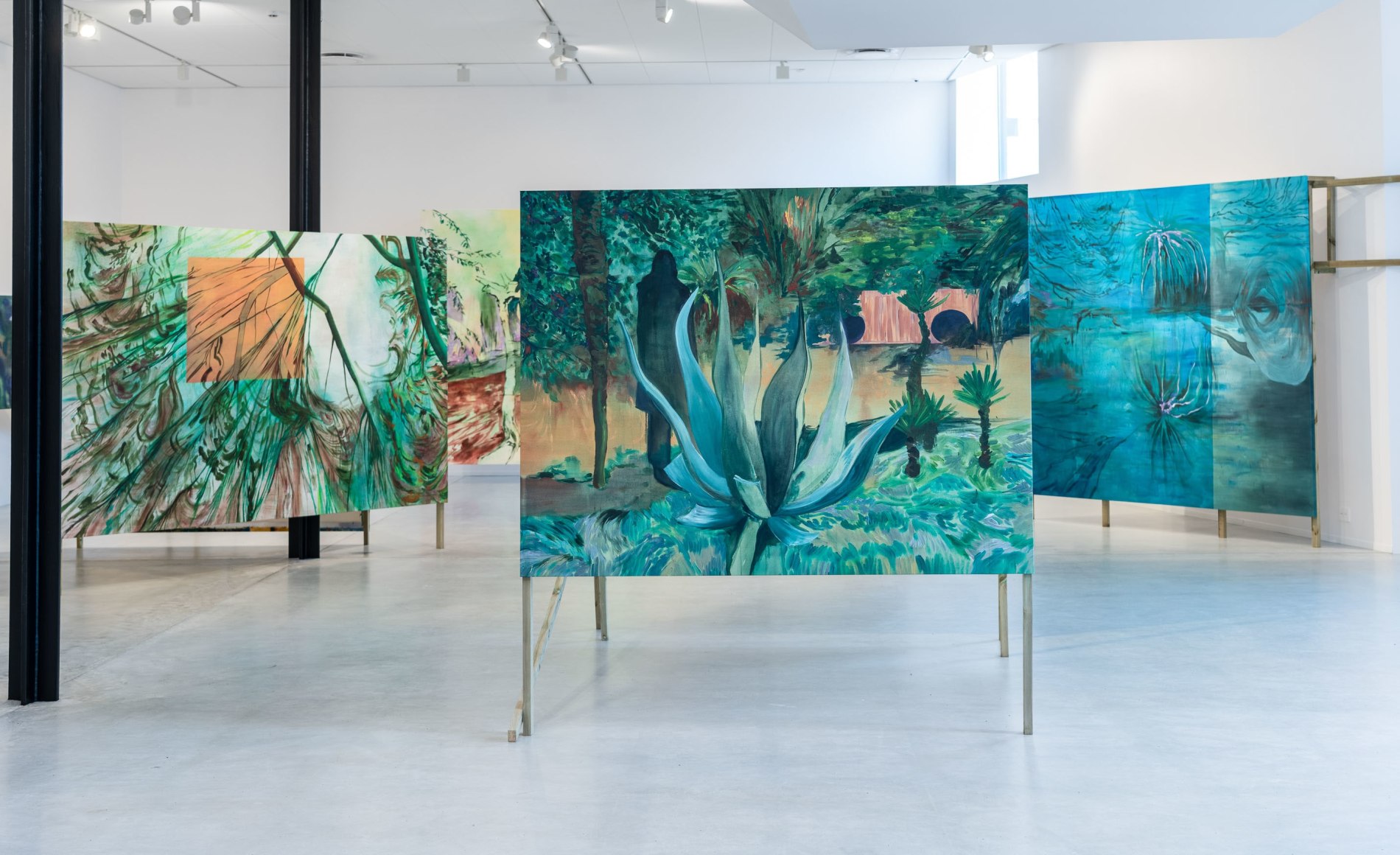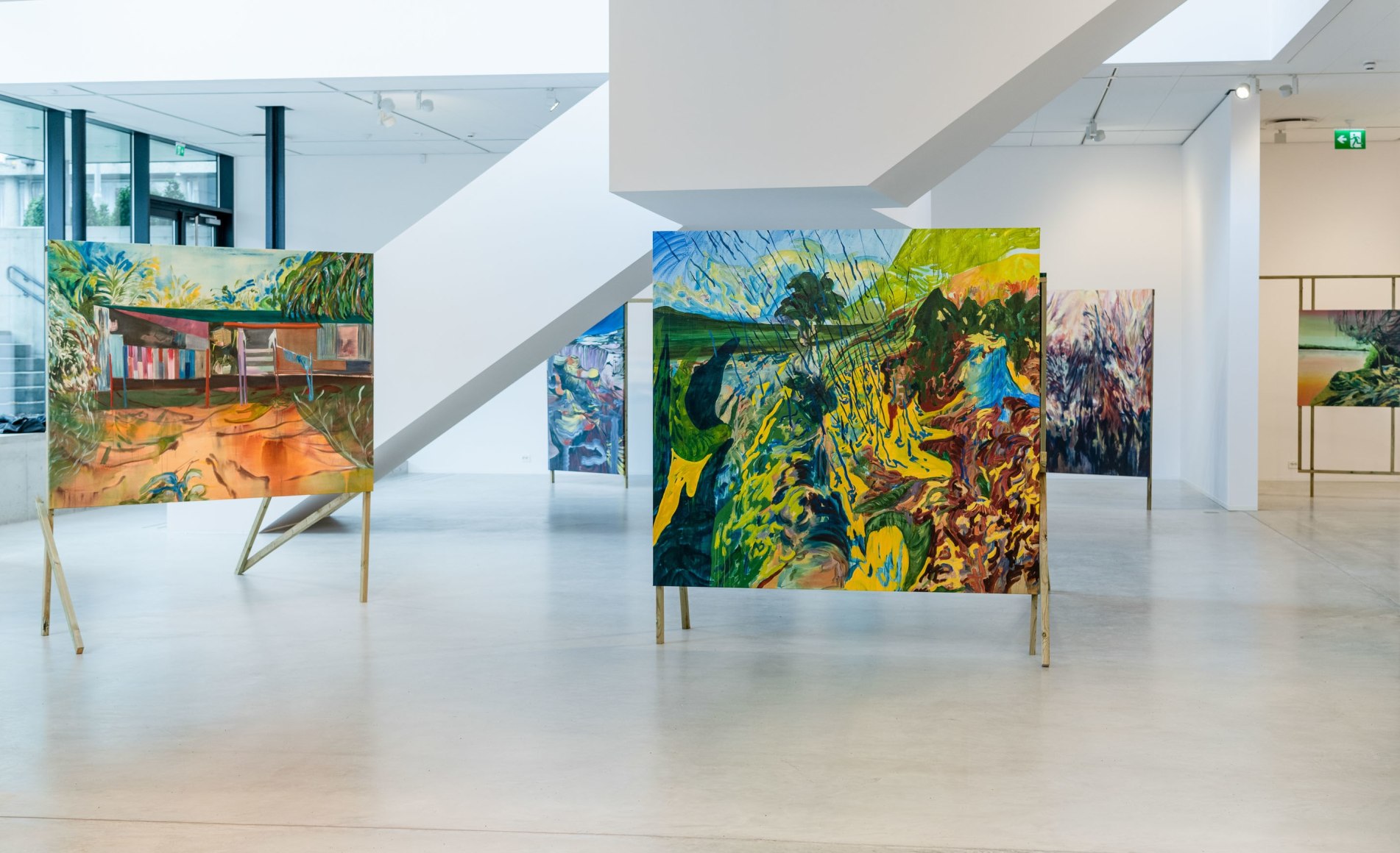 I always work on several paintings at the same time. When paintings are made like this, they are born in dialogue with one another. Relations are drawn. Although not always visible, I believe they are still felt. Each painting works by itself and can stand alone, but together they are thought up as part of a whole. This holistic space carries with it atmospheres, narratives, relationships. They make up an environment, which potentially leaves imprints. In the final scenography of the exhibition, a material framework is thought out in relation to the given architectural space. These material constructions become the skeleton that holds the paintings together.