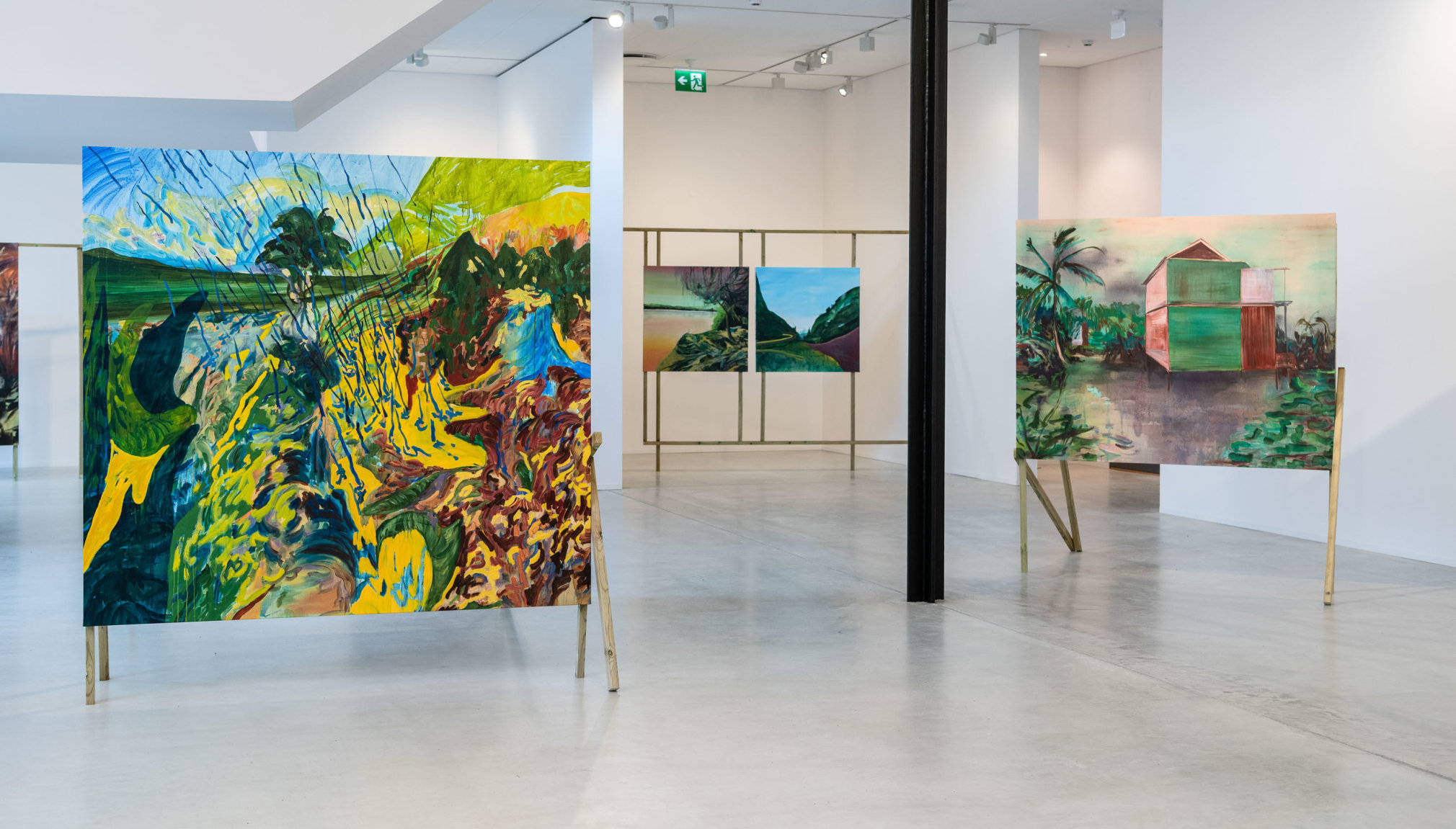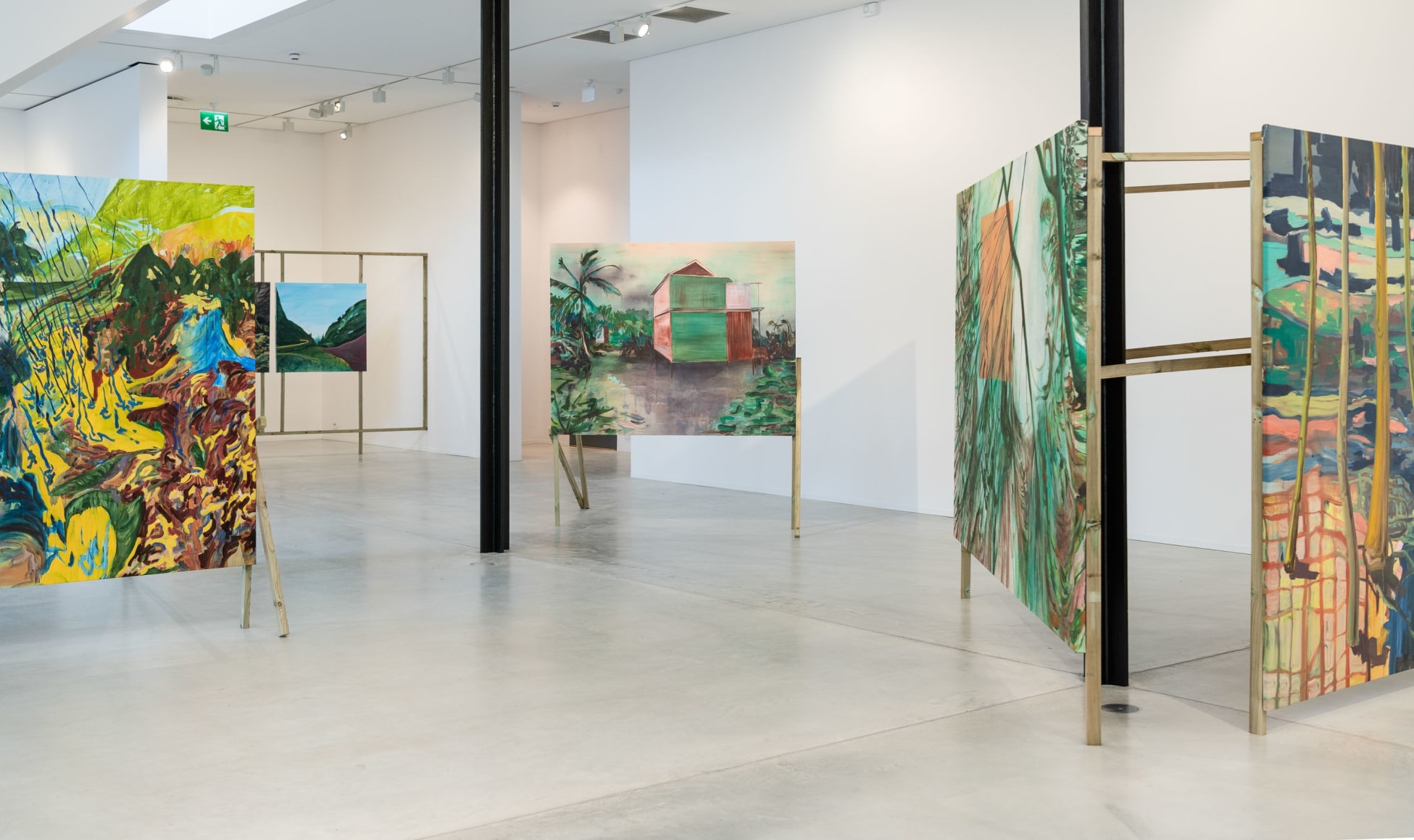 Wanthiang’s paintings are often painted with a thin and fast-drying acrylic paint, causing some surfaces to appear almost washed out, and unexpectedly dry. She paints motives as if they are floating on the canvas, and vegetation as if they are anthropomorphised, with movements sweltering through the layers of paint. Brash and lively strokes of paint are evident through the painted landscape’s, moist or cracked surfaces.