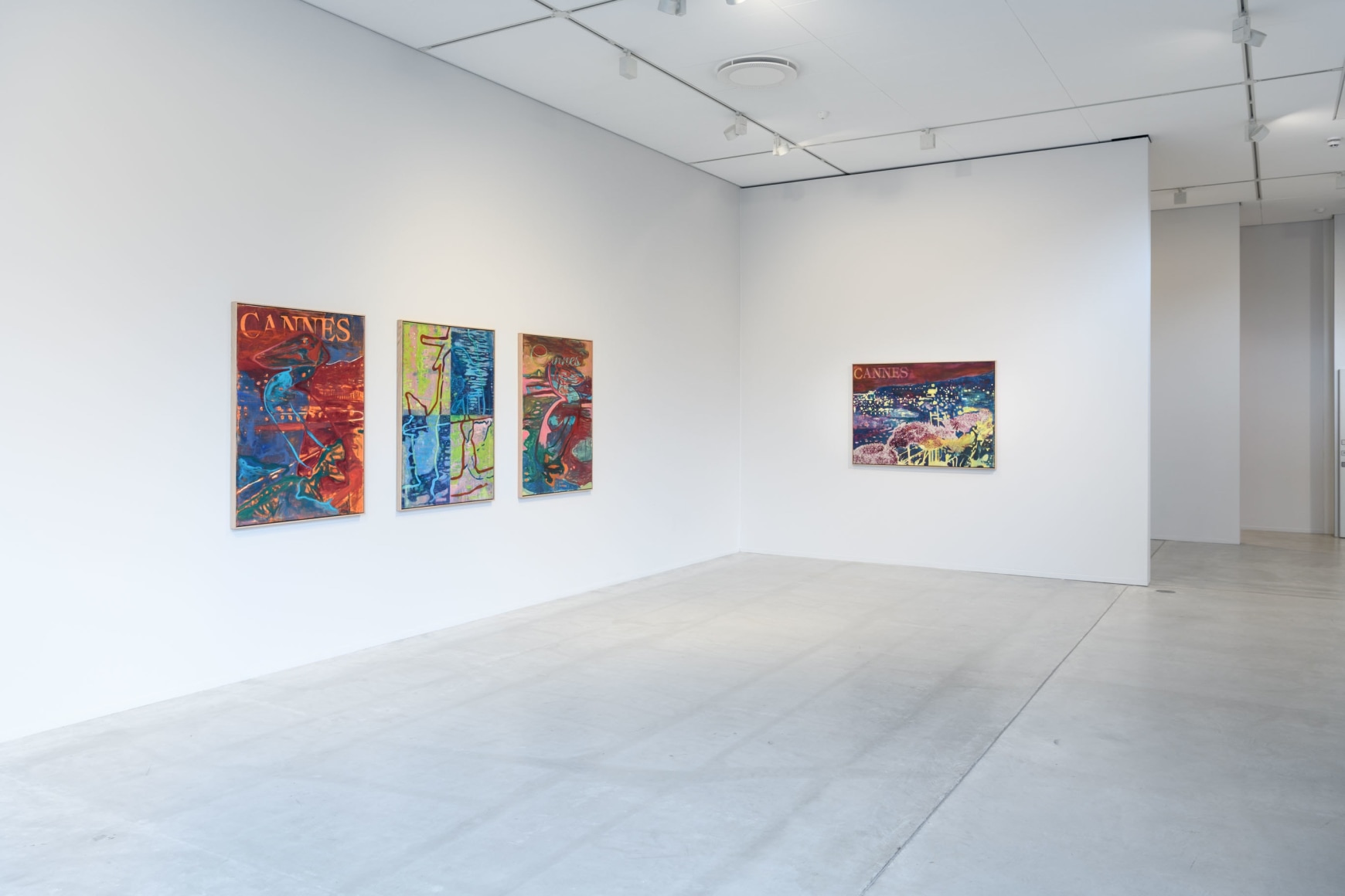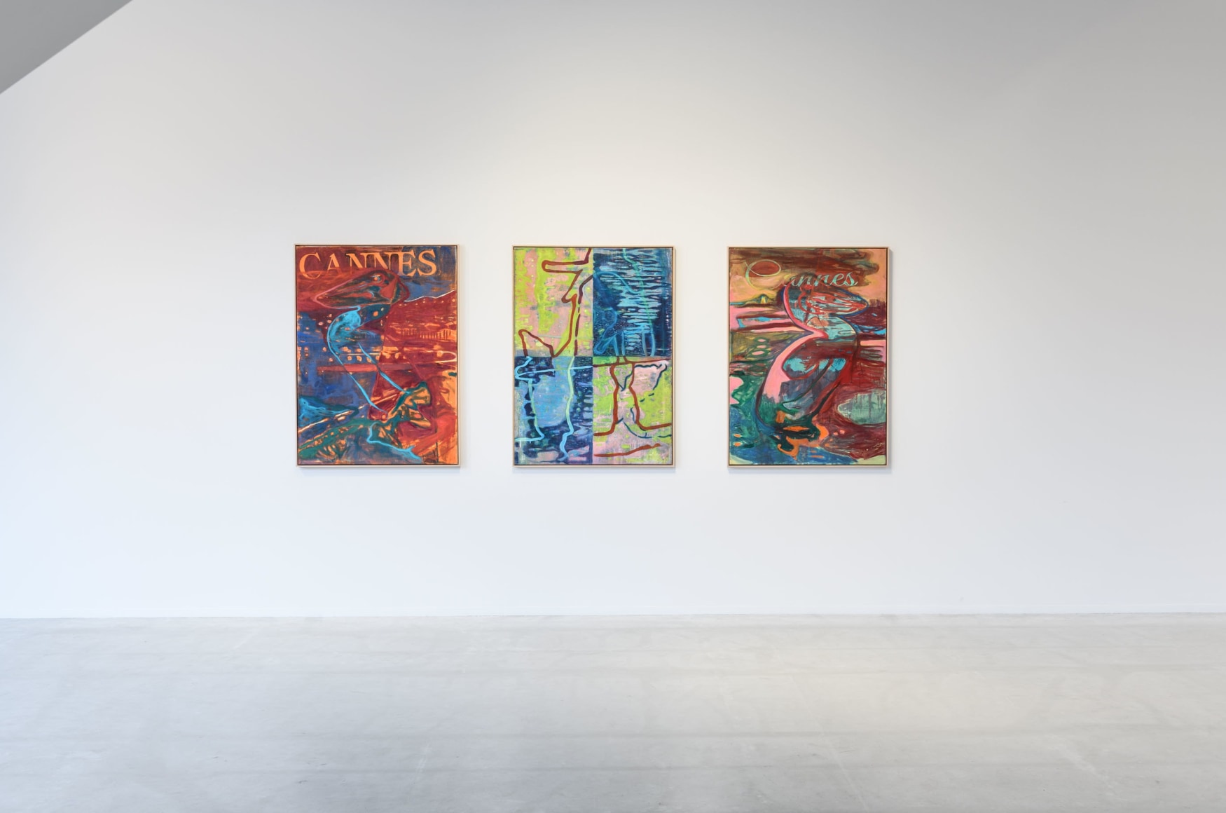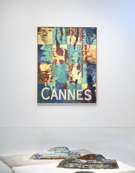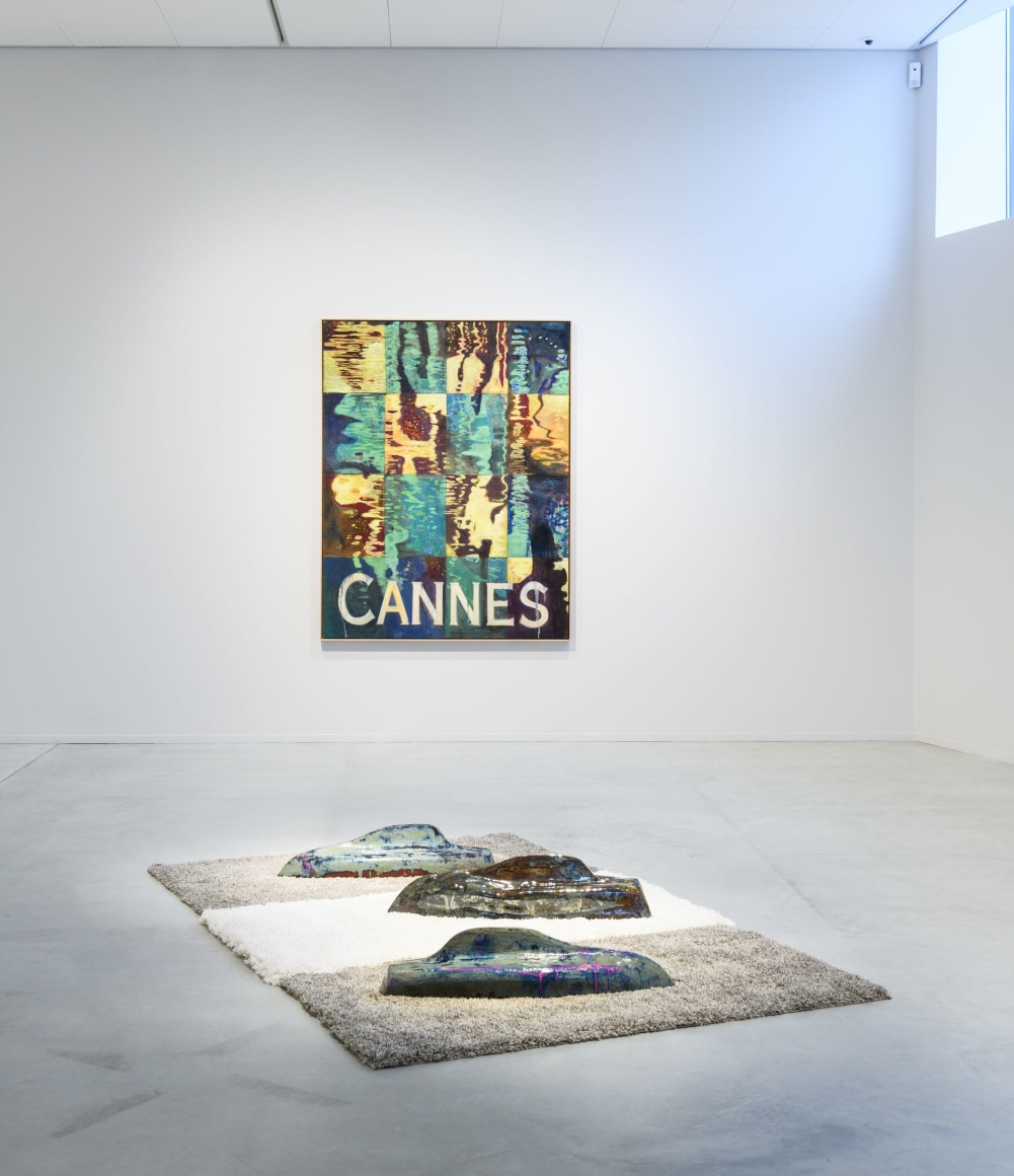 A painting depicting the inviting water from the Cannes riviera lends the exhibition its title, «GREETINGS FROM». Sæther is referencing a postcard. The water is charmingly illuminated by the reflection of the city lights. Postcards famously show us only an excerpt of the place it greets us from – a small, perhaps superficial, piece of a larger story. This painting gives the spectator a clue towards Sæthers ambivalent experiences from Cannes; impressions of glamorous illusions. They are inviting, but like the water that reflects them, the surface is easily broken.