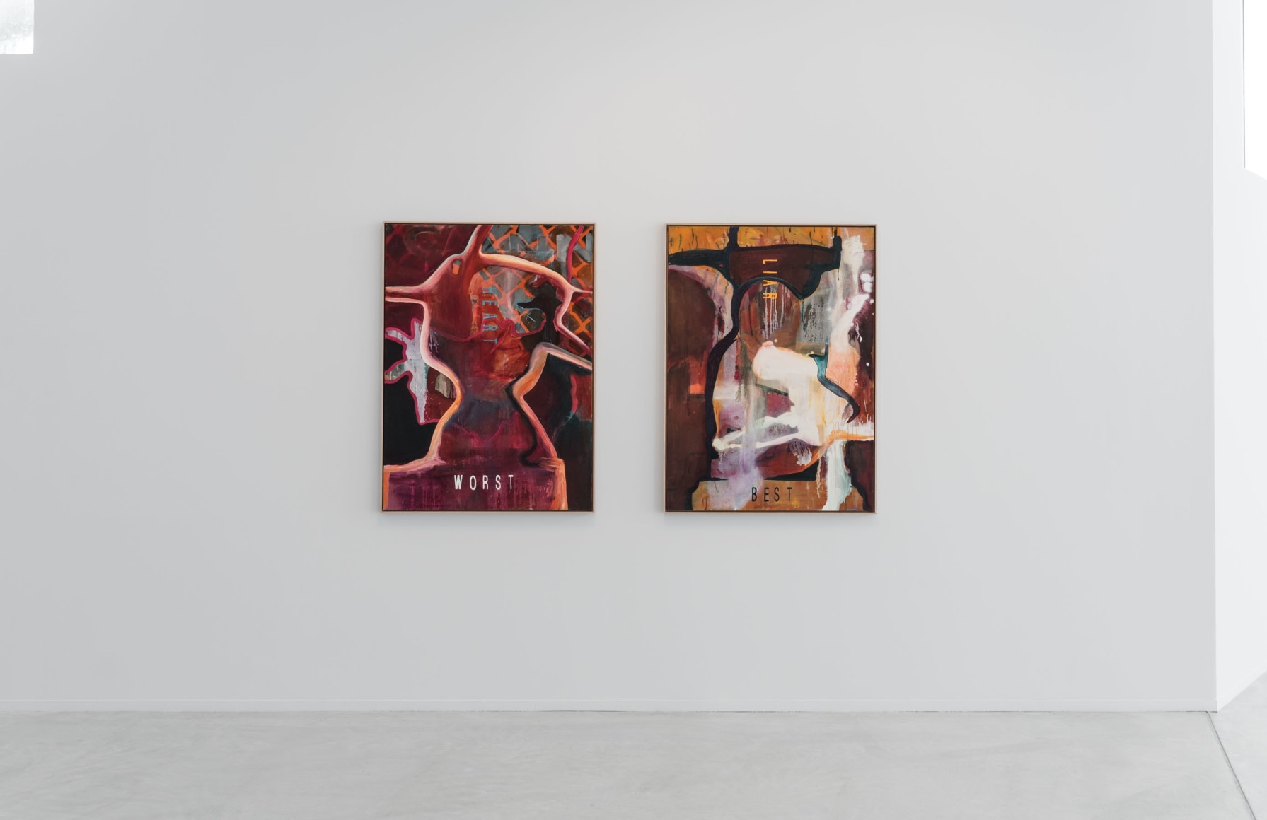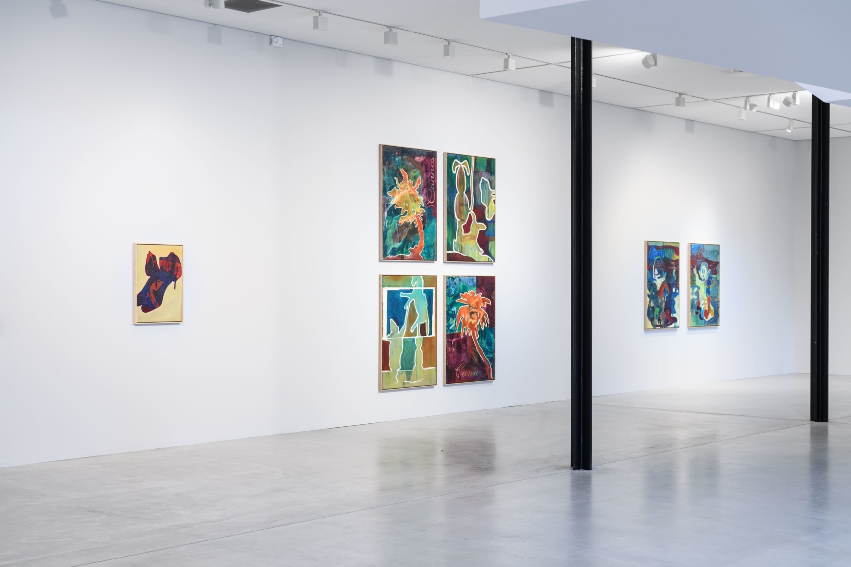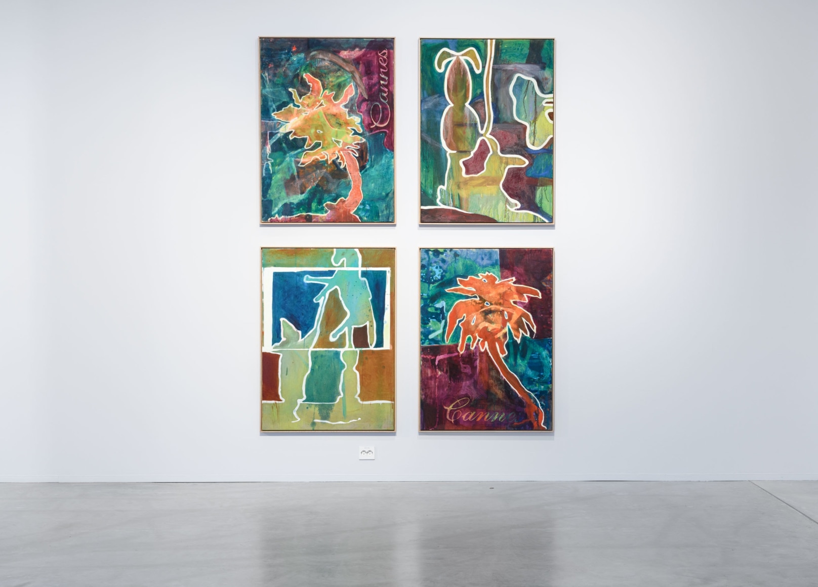 In his paintings, Eirik Sæther works in the intersection between abstraction and tangible motifs. Most of the painted backgrounds have their starting point in a selection of postcards from Cannes. These are reworked and combined with figures that resemble trophies. As we know, a trophy is awarded to someone who distinguishes themselves, but Sæthers trophies carry an ambiguity. The golden palm is exchanged for the plastic figurines that children receive at the dentist, homemade christmas decorations and wrecked public sculptures. Thus, Sæther questions the value we put in these objects, and whether it is the objects that add value to a phenomenon or the other way around. The words on the paintings give a bitter aftertaste, what is rewarded are values we do not usually celebrate out in the open. But, maybe it is precisely these values that lie beneath the surface of all the glam and splendor.