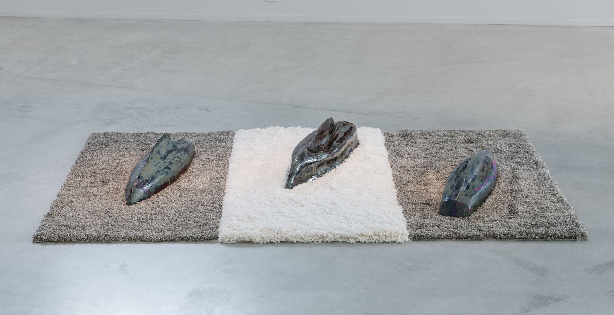 Symbols of power and prosperity are repeating elements in this exhibition. From luxury boats to trophies: The Cannes Film Festival is not shy to flash its wealth. However, upon seeing Sæthers sculpture of a yacht in the artwork «Below Deck», we note that the boat is capsized and scratched. This tagged down hull is far removed from any notions of wealth. What previously was a glamorous boat is ruined and capsized, its pedestal reduced to a cheap rug. What used to stay beneath the surface is exposed, and the illusion is broken.