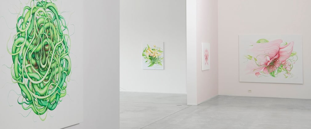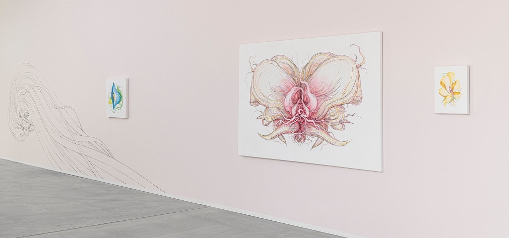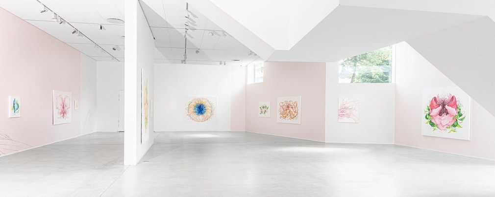 In “PORTAL” one encounter Marit Victoria Wulff Andreassen’s recognizable, but peculiar universe of imagery, organic forms, veins-like roots, flowers and hair. Her art works of drawing, painting and monumental murals, float between stylized, surrealistic, while simultaneously being figurative and romantic.