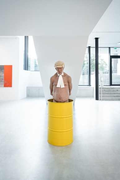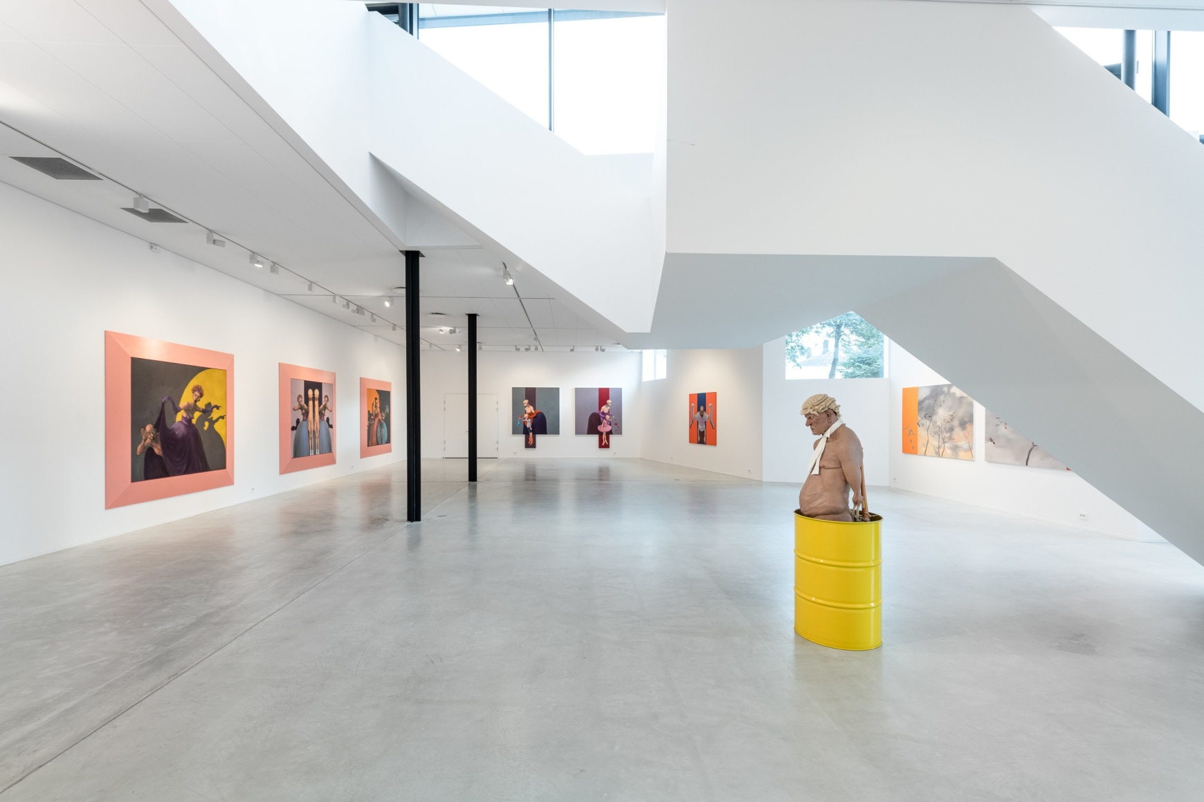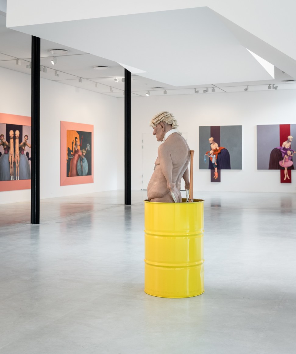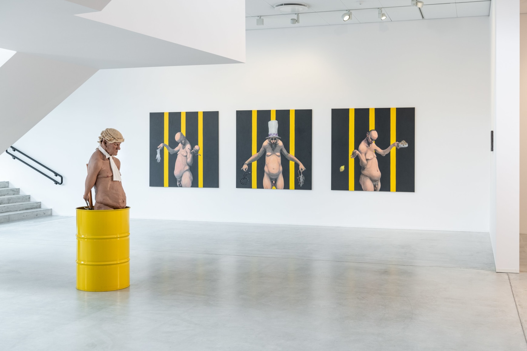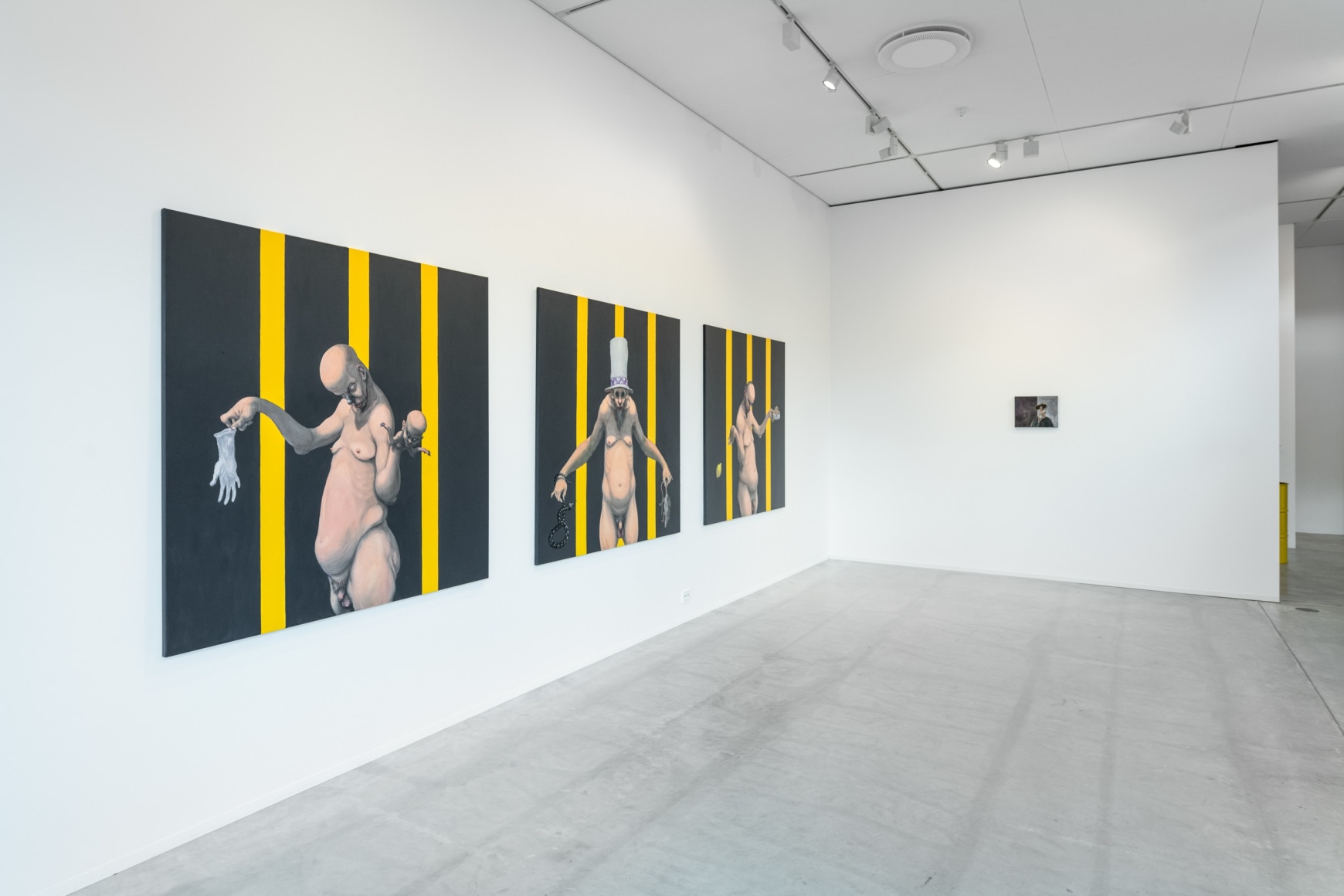 Michael Kvium’s painterly staging contains associations to a theatre stage. As a theatre plays a story that unfolds in the interval between the curtain rise and fall, human life unfolds between life and death; “The performative language and the theatrical compositions are fundamental to my work as an artist. In the three works "Naked Act", the characters present a few objects, detached from their known reality and therefore made visible as a reference to or as a question about the object’s layers of meaning. Is an ashtray or does it point to other layers of narratives?” The artist reflects.