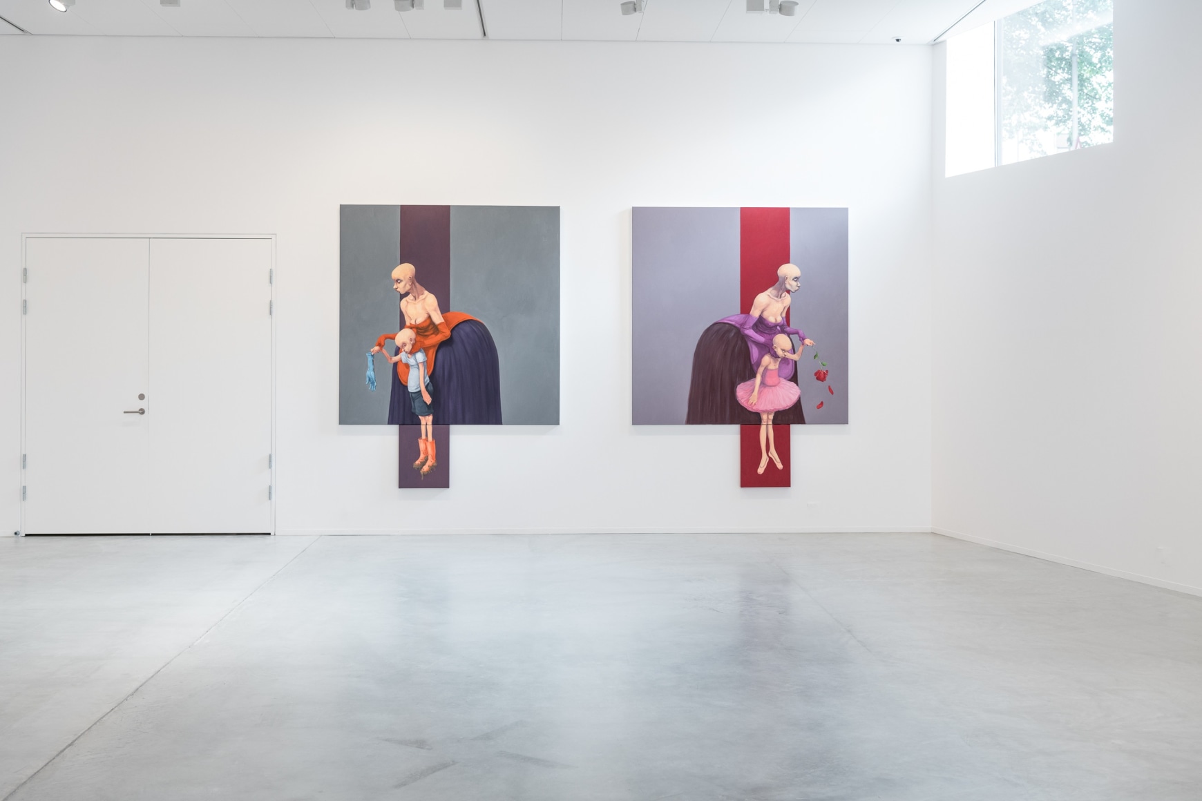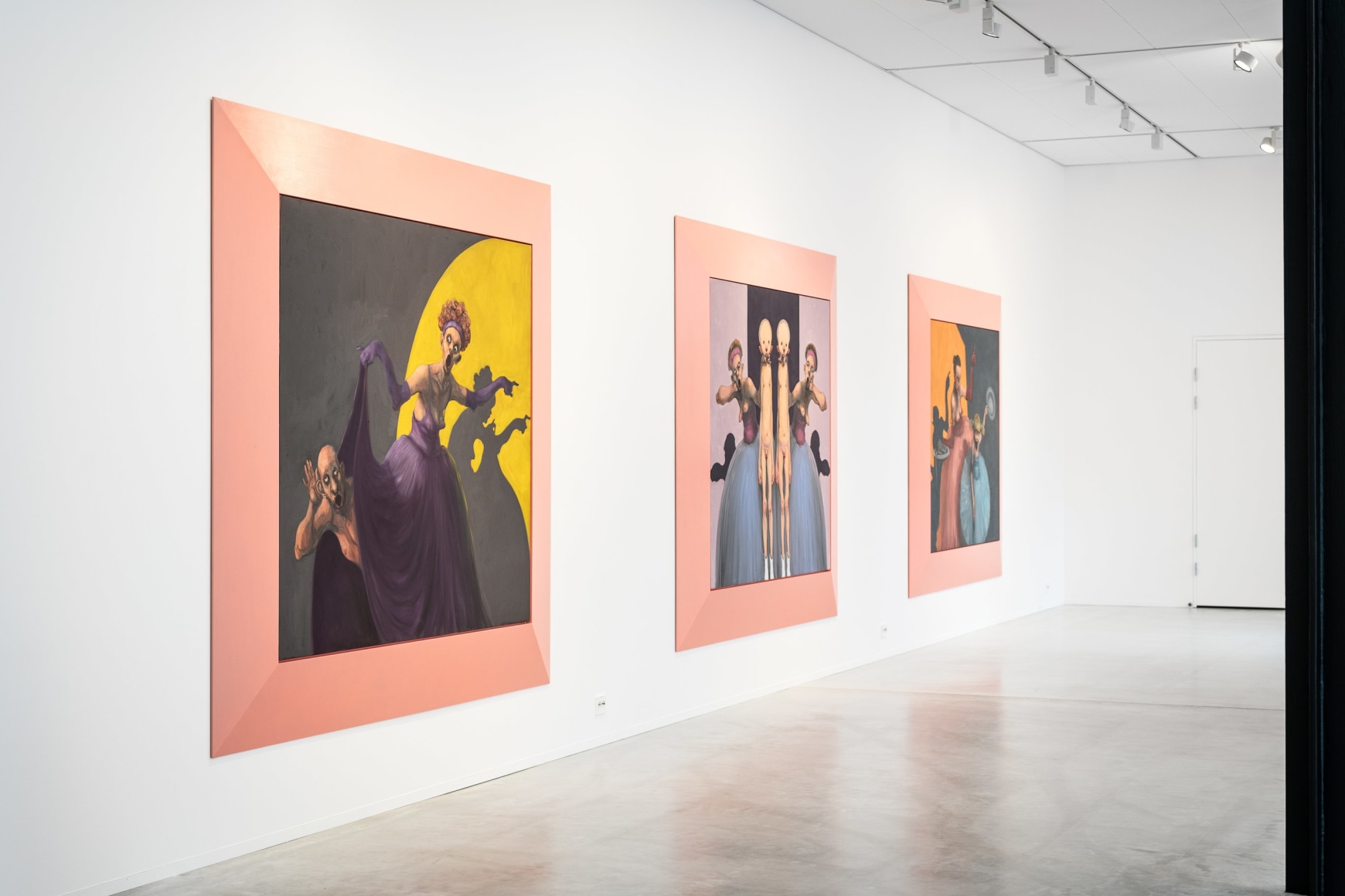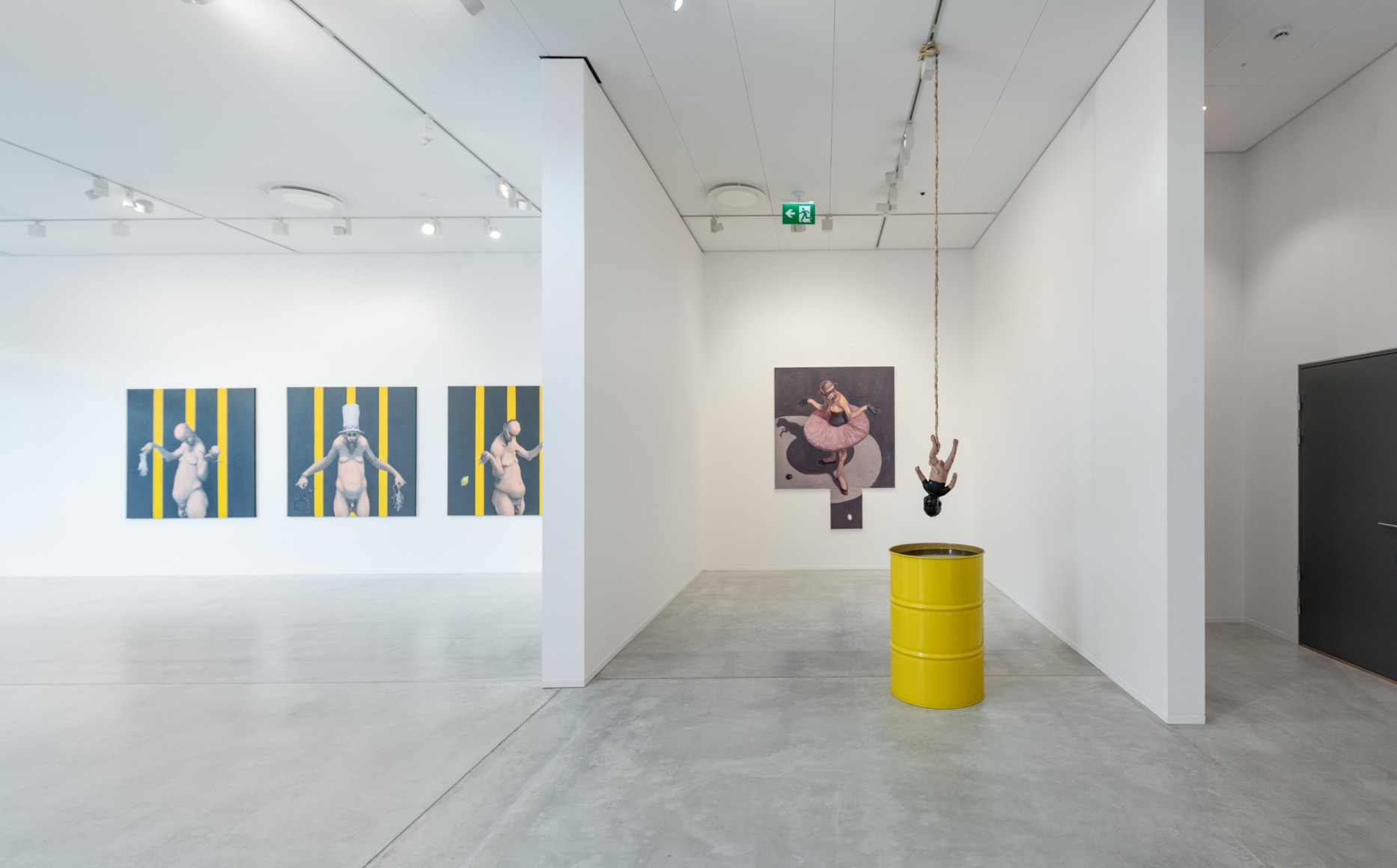 Kvium’s art deals with existential subjects, and shows uncompromising portrayals of the aspects of life that we rather hide than expose to observation; I call 3 larger works “ tap scenes" with the completely hidden reference to the concept "Soap Opera", we know from TV productions. Something mundane that continues indefinitely and superficially smooth on the surface. Soap is usually something we associate with cleanliness, but it is also something we can slip into and fall to the ground. We speak figuratively of washing our hands when we renounce responsibility. In soap-coloured frames, I have painted visual soap-operas based on everyday-like scenes in paradoxical situations. When the unbearable blindness of everyday life is peeled off, we are left with a reality that most often questions the boundaries we stay within or cling to.
