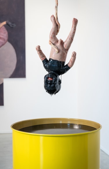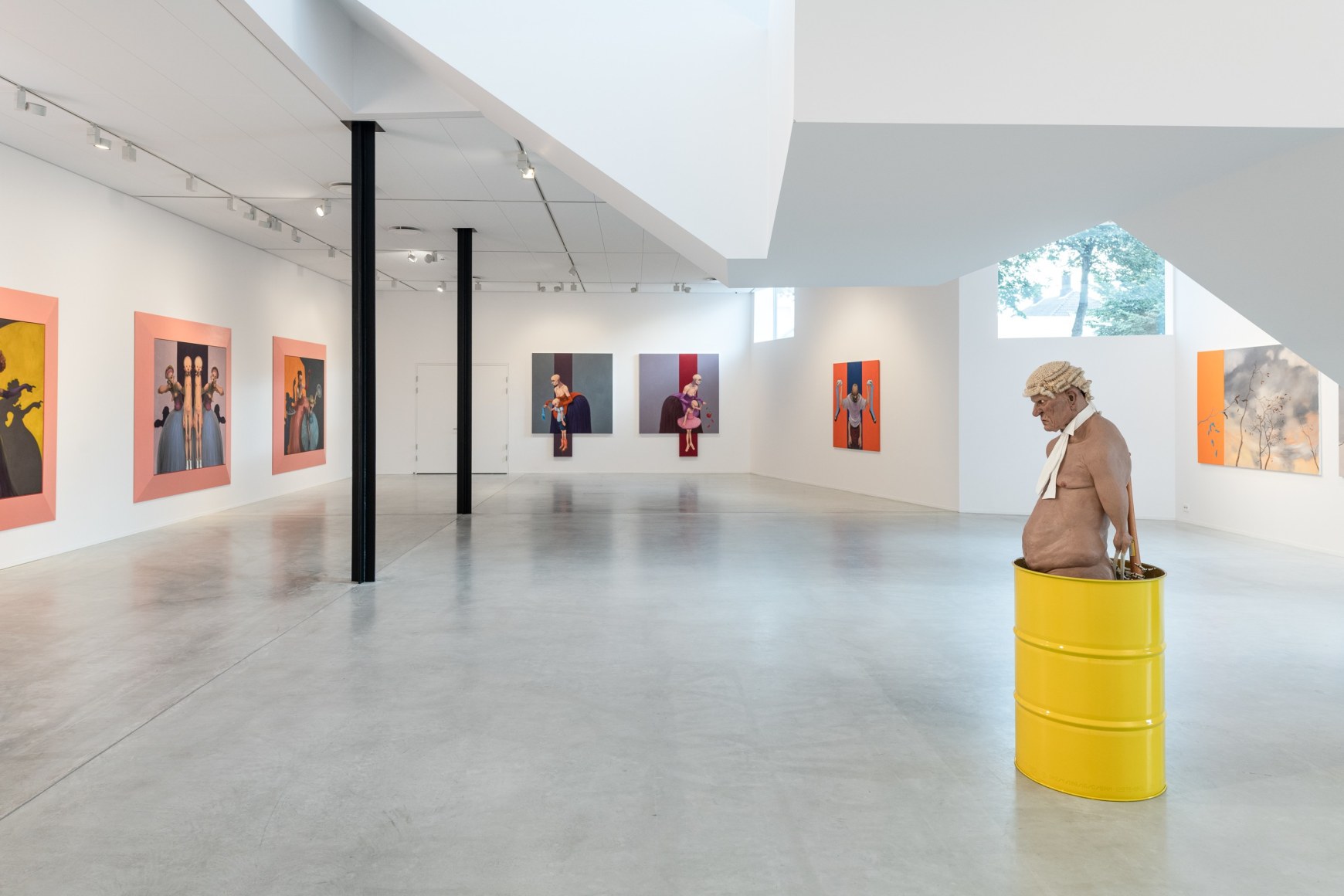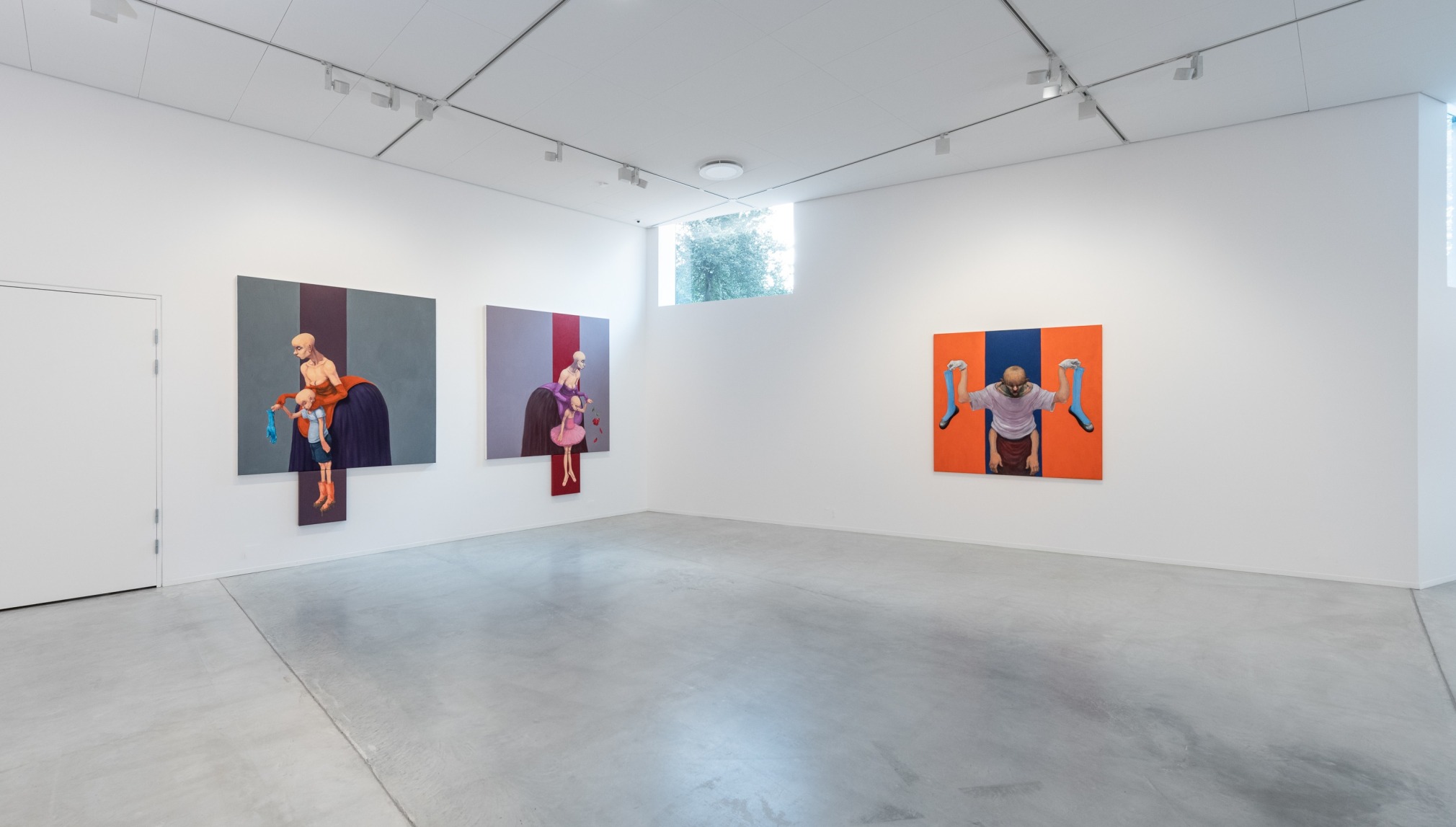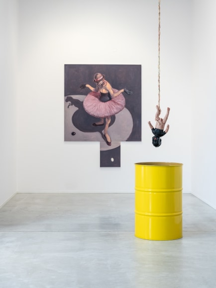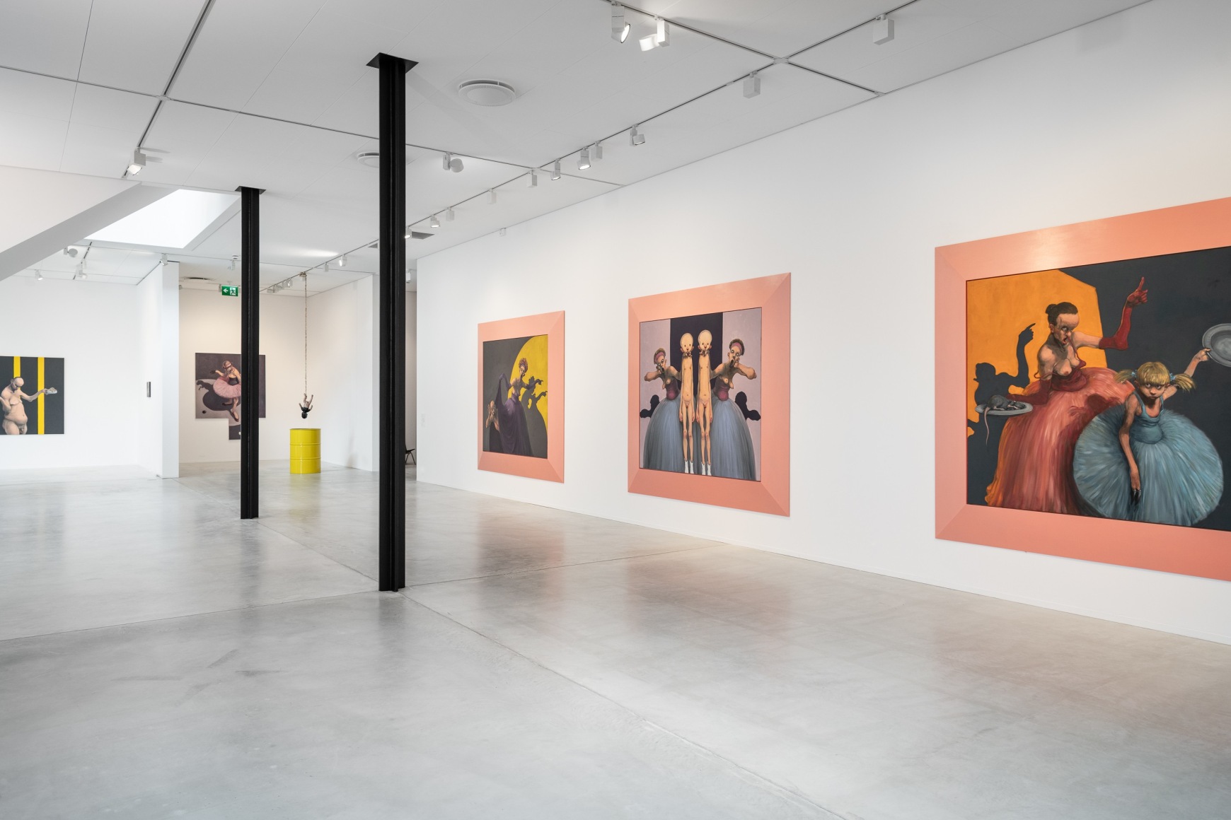 Kvium’s art deals with existential subjects, and shows uncompromising portrayals of the aspects of life that we rather hide than expose to observation; I call 3 larger works “ tap scenes" with the completely hidden reference to the concept "Soap Opera", we know from TV productions. Something mundane that continues indefinitely and superficially smooth on the surface. Soap is usually something we associate with cleanliness, but it is also something we can slip into and fall to the ground. We speak figuratively of washing our hands when we renounce responsibility. In soap-coloured frames, I have painted visual soap-operas based on everyday-like scenes in paradoxical situations. When the unbearable blindness of everyday life is peeled off, we are left with a reality that most often questions the boundaries we stay within or cling to.