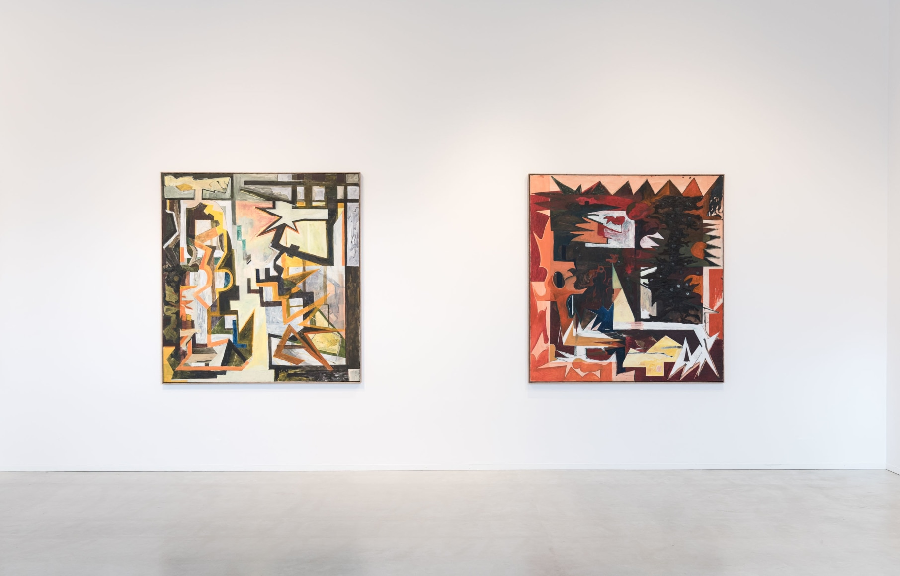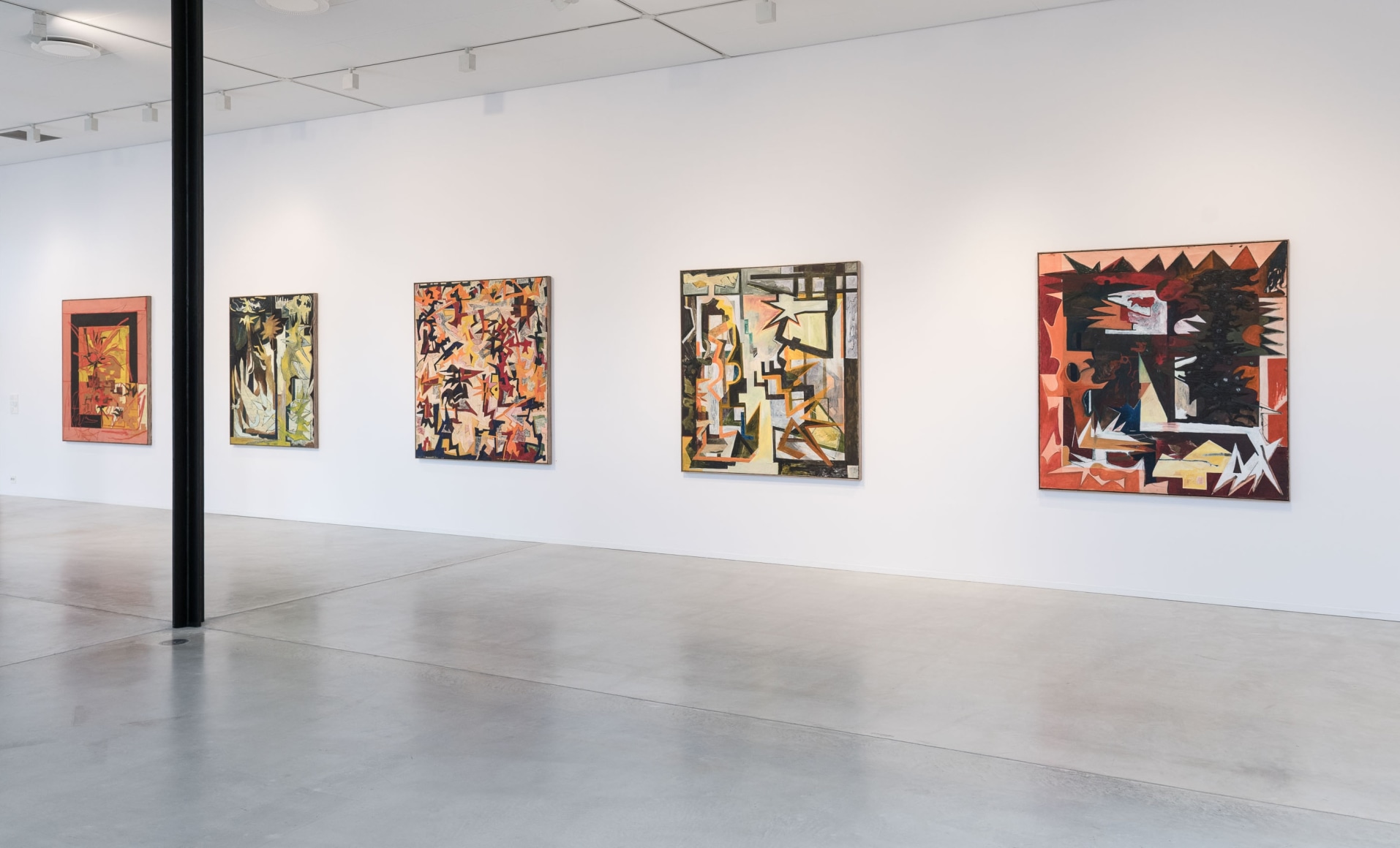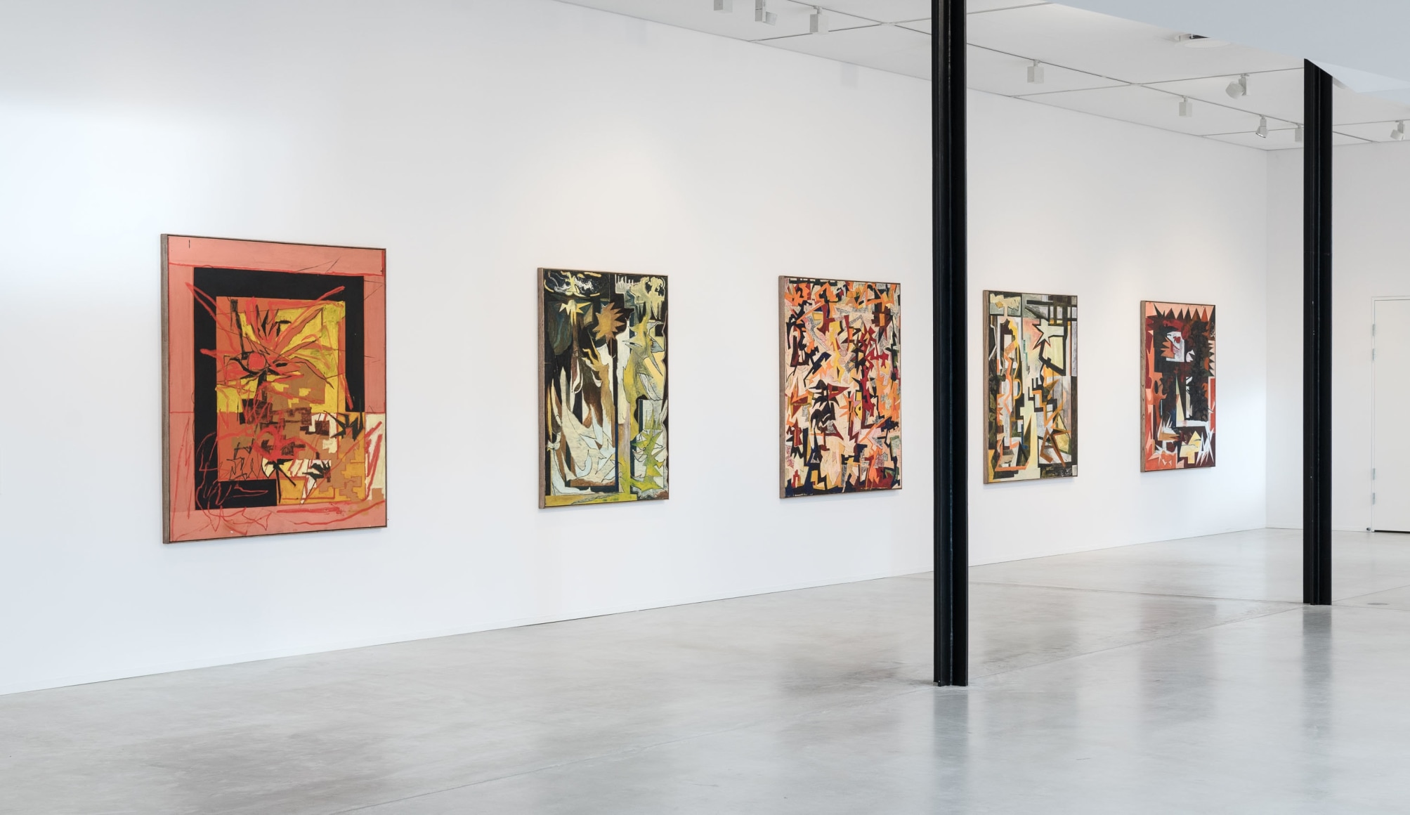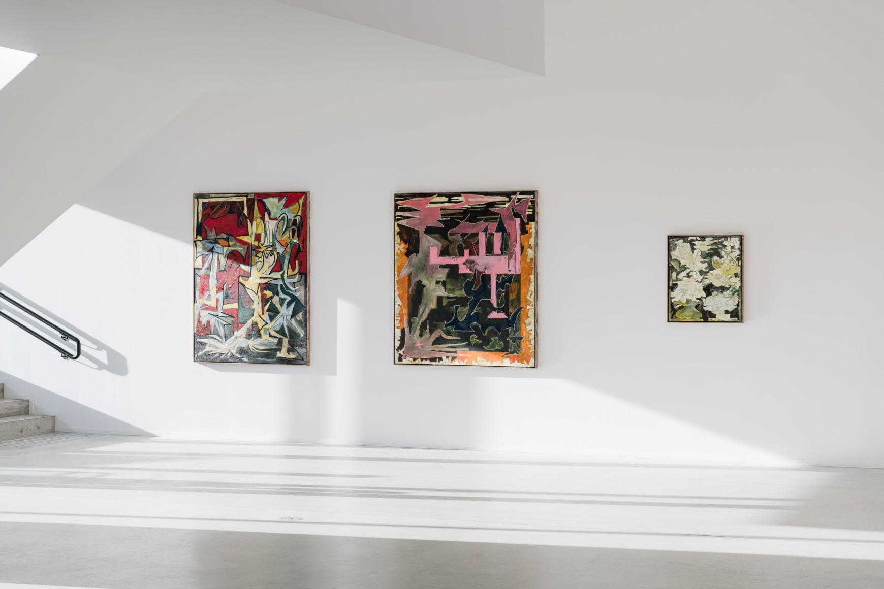 Only to a certain point does the process seem controlled and systematic; each artwork appears to have its internal structure, a compositional battle plan. Outlined basic shapes in oilstick can, in negotiation with the brushstrokes, just as easily be displaced and disappear as confirmed. The lines slide above and below. Some paintings are treated as sketches, where the shapes almost mutate. They stretch out and repeat themselves. Star shapes and jagged lines form energy fields, but the lustre that surrounds them is often dirty – some parts have undergone a rough treatment and become ugly and stubborn. Several of the paintings contain something explosive and wild that threatens constructivist principles and disrupts forms in ornamental elements. Small slits stand out from the purely nonfigurative and give ambivalent form to something vaguely recognizable, objects, architecture and plants in a painterly world. A white flower in a vase thus acts as the idea flower multiplied into a shape generator that has run wild.