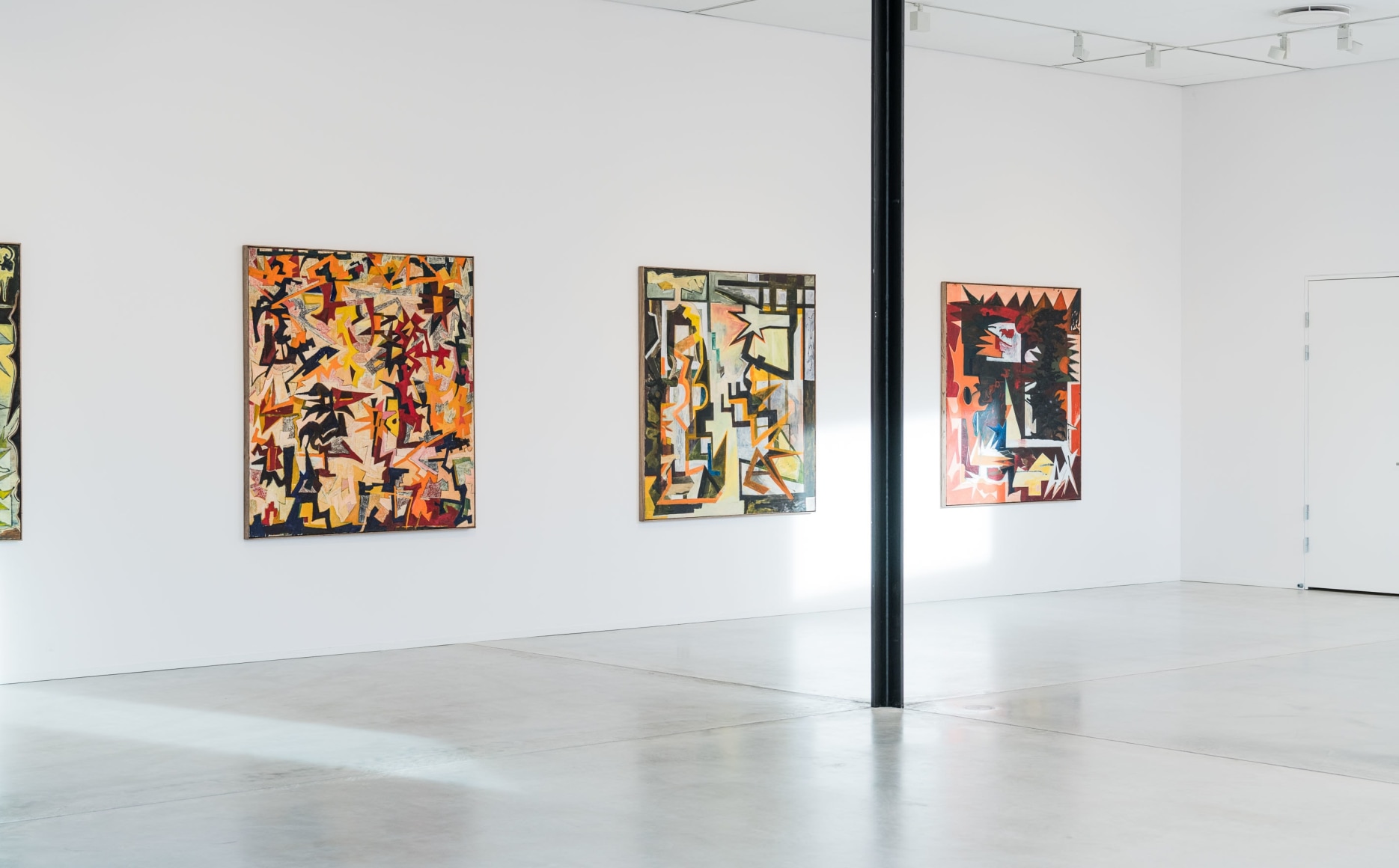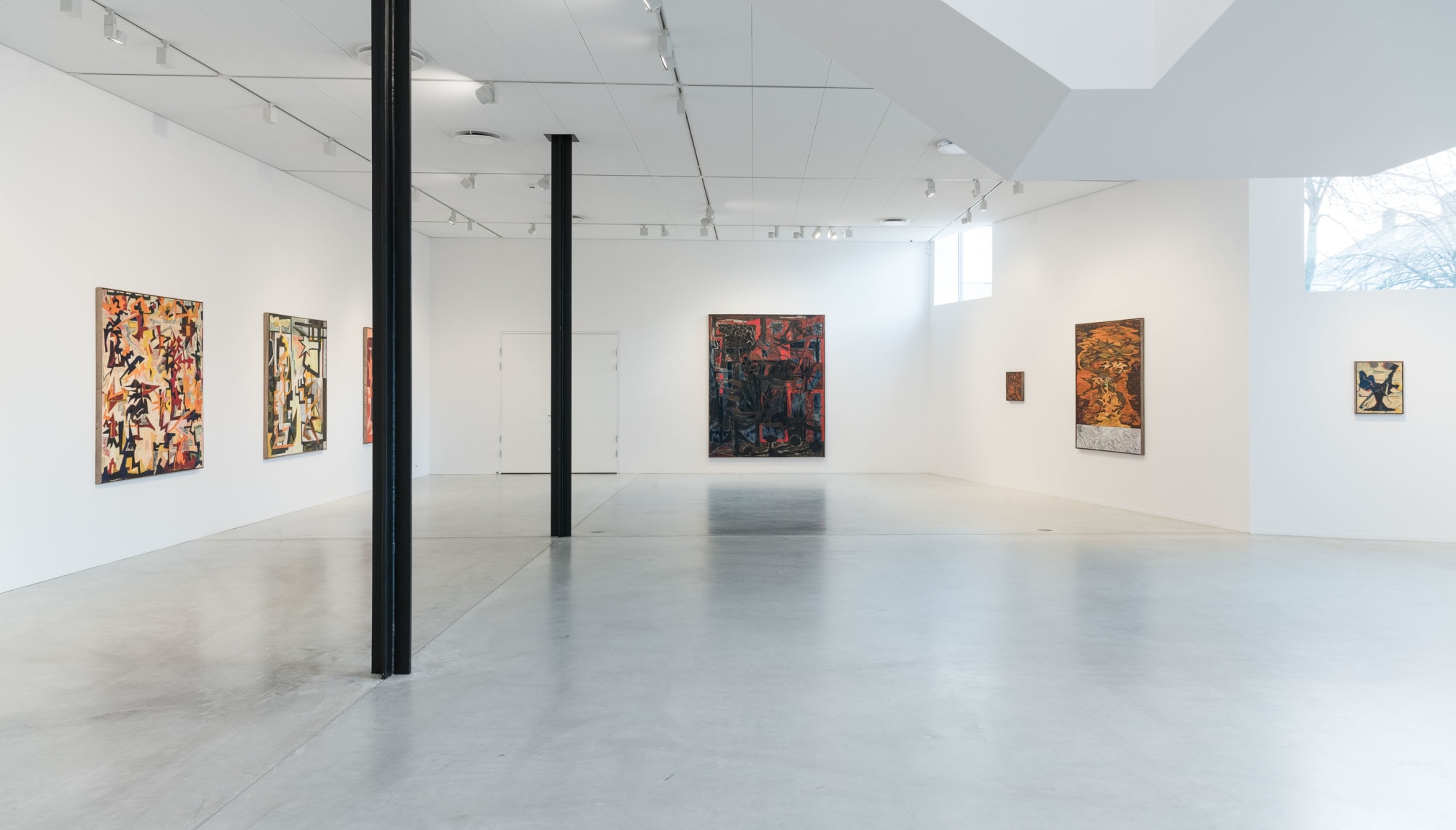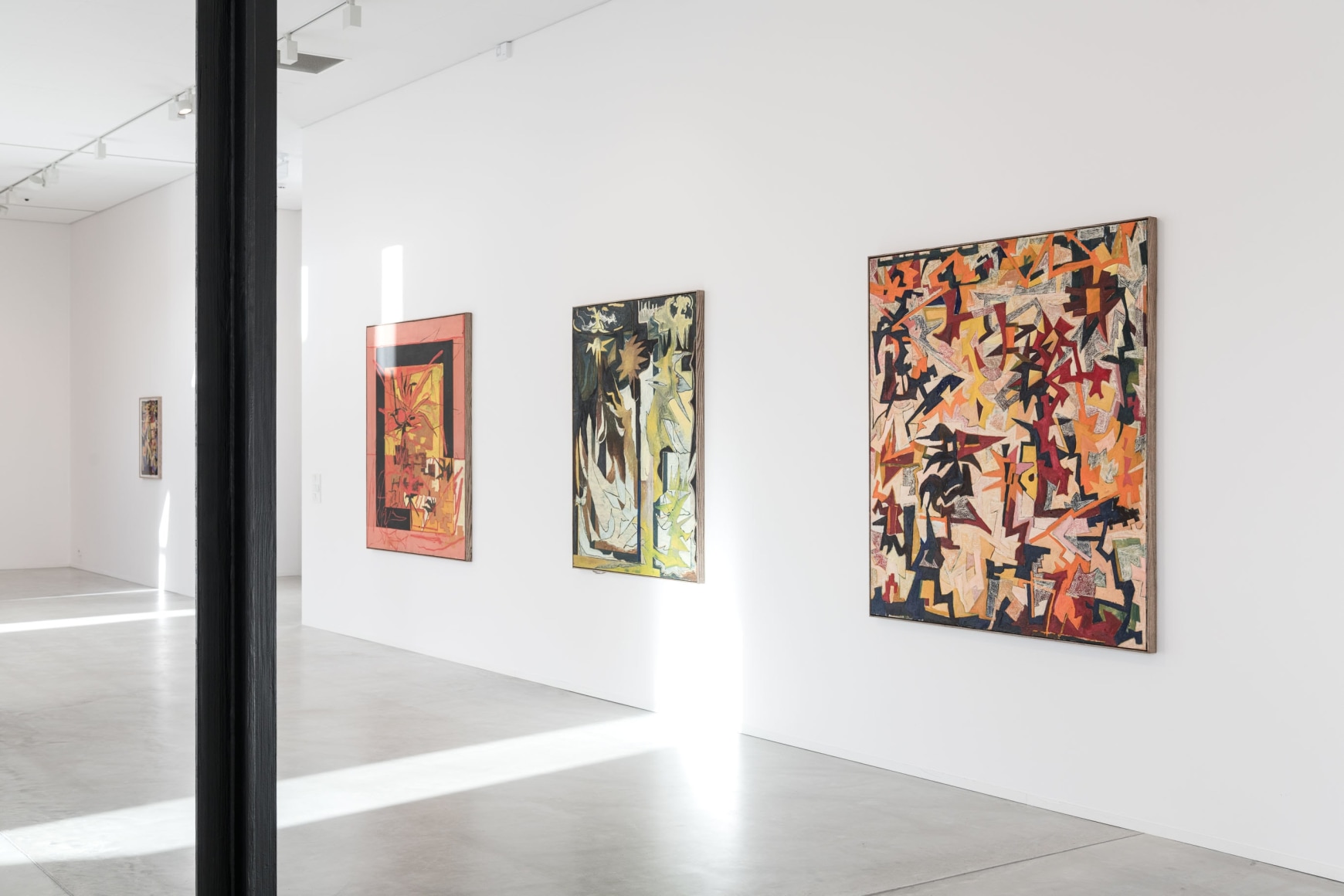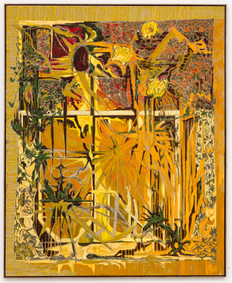 Only to a certain point does the process seem controlled and systematic; each artwork appears to have its internal structure, a compositional battle plan. Outlined basic shapes in oilstick can, in negotiation with the brushstrokes, just as easily be displaced and disappear as confirmed. The lines slide above and below. Some paintings are treated as sketches, where the shapes almost mutate. They stretch out and repeat themselves. Star shapes and jagged lines form energy fields, but the lustre that surrounds them is often dirty – some parts have undergone a rough treatment and become ugly and stubborn. Several of the paintings contain something explosive and wild that threatens constructivist principles and disrupts forms in ornamental elements. Small slits stand out from the purely nonfigurative and give ambivalent form to something vaguely recognizable, objects, architecture and plants in a painterly world. A white flower in a vase thus acts as the idea flower multiplied into a shape generator that has run wild.