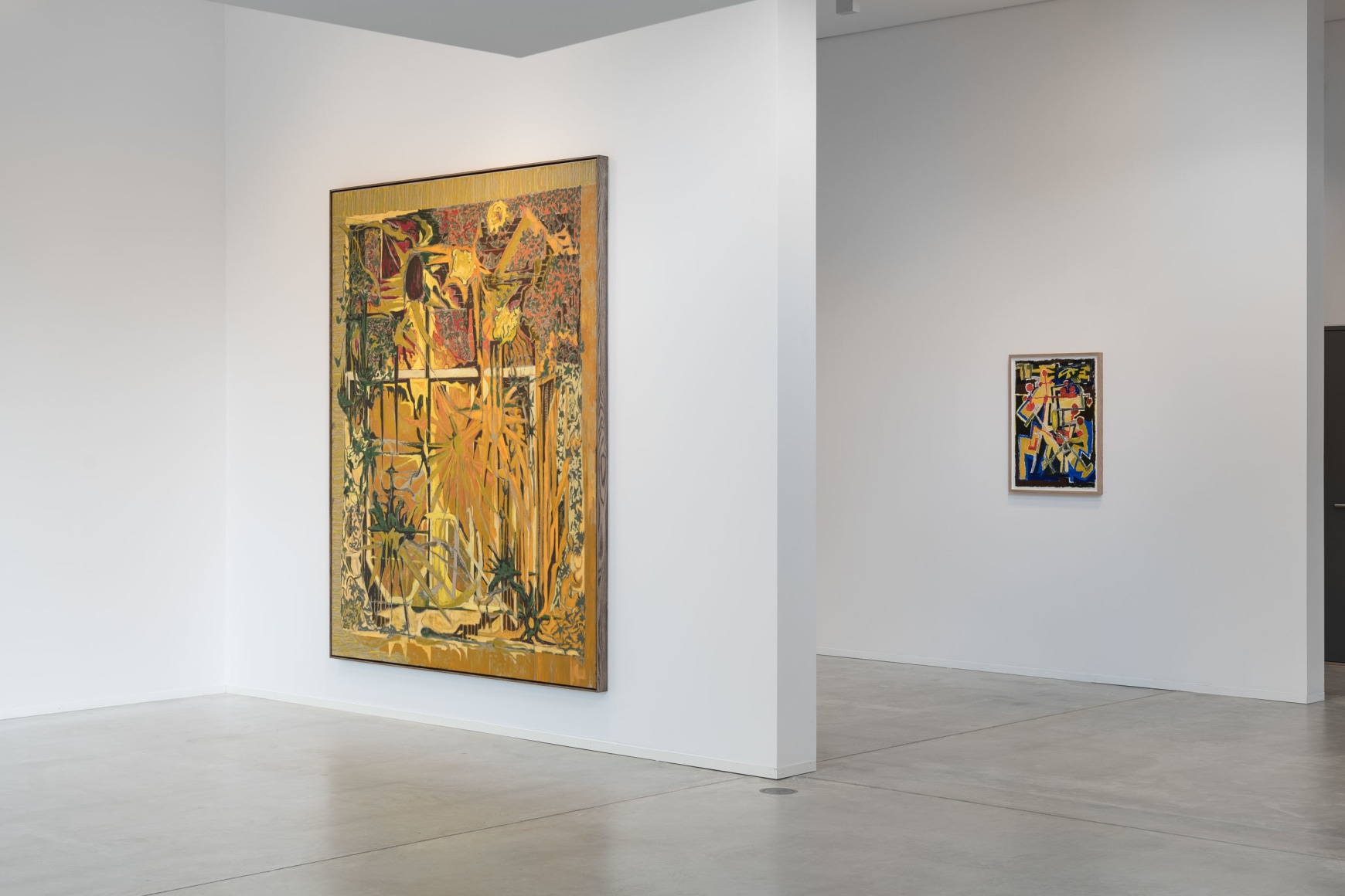 Sørfjordmo describes his paintings as “walk-ons” in his own world, in a kind of stage room. They are rigged with straight lines replaced by ruins. Portals and barriers perform side by side. As the artist sees it, the construction and dynamics of each painting revolve around two protagonists in interaction and potential battle - one bends to the other, showing something off. Pro and contra. There is an approach to debris and glitter, gold paint has lost its splendour and it oozes oil paint and turpentine. The play is scenic without posing, and occasionally takes place on rough canvas that works both against and with the strokes. Sørfjordmo insists on his chosen material: the surface, the brush strokes, the baselines and the colour deposits.