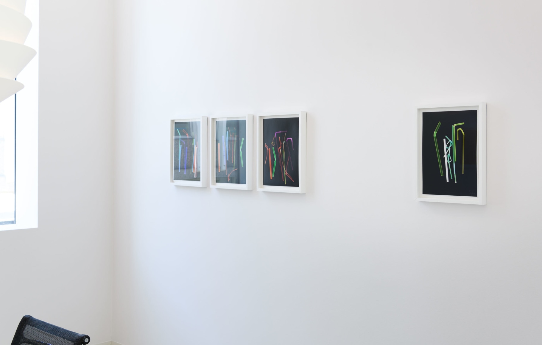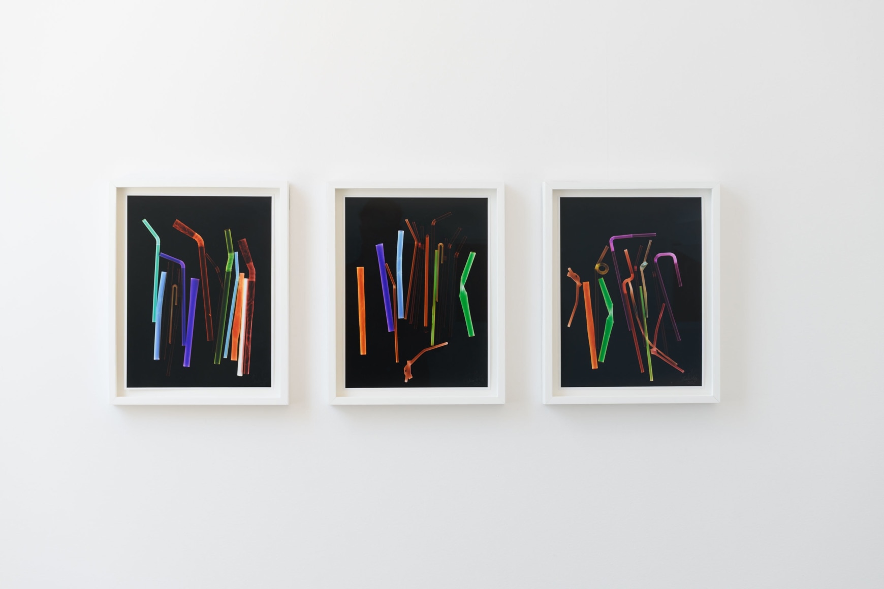 In the series Plastic Fantastic, the artist has created photograms—unique photographs made without a camera—where parts of her extensive collection of plastic straws are arranged in bouquets of vibrant color combinations directly on light-sensitive photo paper, then developed. The result is ghost-like traces of the objects, floating in darkness as colorful, repetitive sequences that glow in complementary colors to the original straws. The title Plastic Fantastic points to the material’s duality and recalls the futuristic optimism of plastic’s revolutionary beginnings—contrasting with the material’s current reputation.