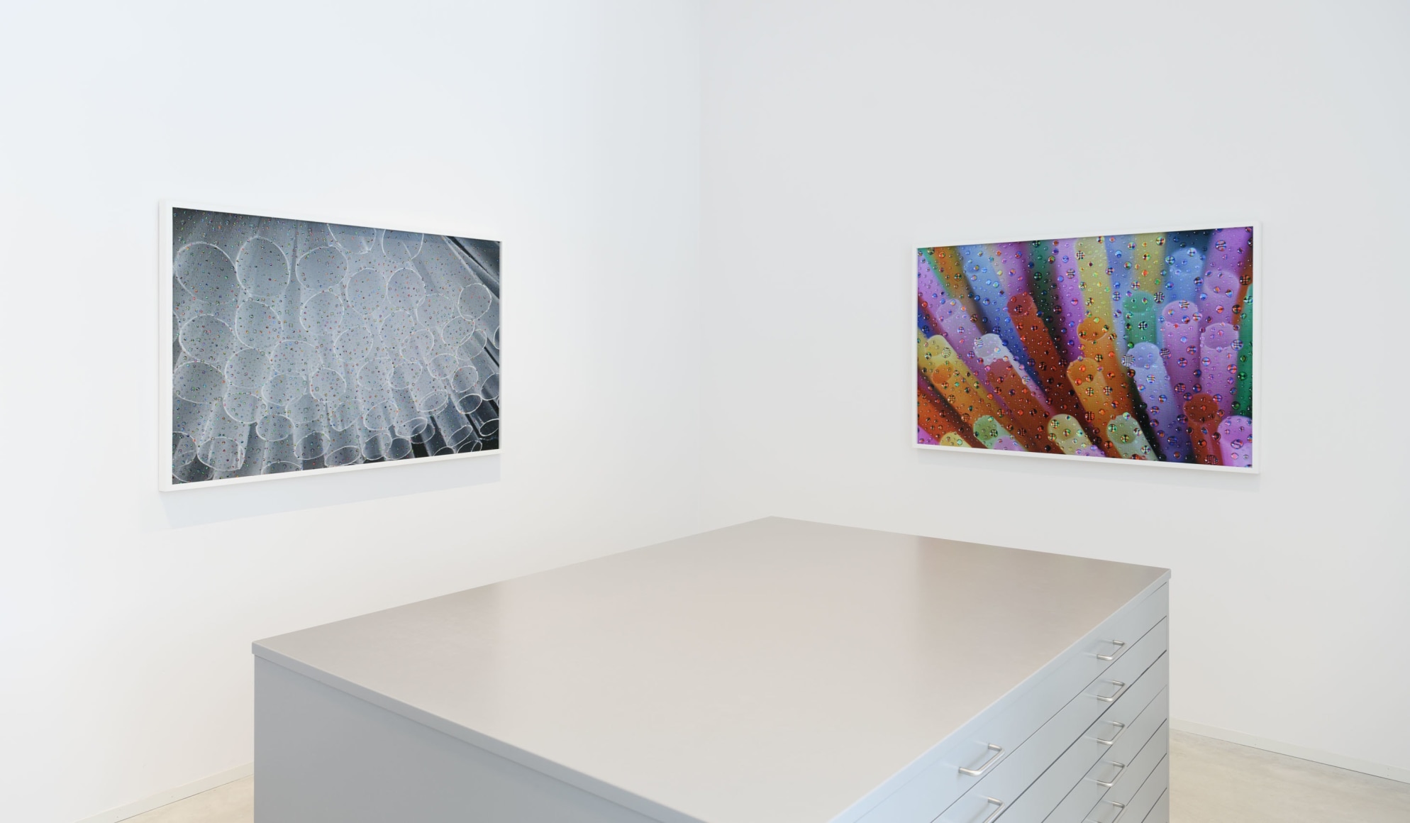 In the Suge (Suck) series, Vaka has photographed the openings of straws in close-up, then rephotographed them via a computer screen covered in organic water droplets—a method she has explored in depth since 2008 in numerous photographic projects, becoming something of a trademark. The droplets act as tiny magnifiers, revealing the screen’s material structure and vibrant pixelation, while the straws are transformed into dissolved, circular, euphoric surfaces. The screen—today our primary window to the world—becomes both a tool and a motif in Vaka’s work. The water poured over the straw openings—but never passing through—can evoke a sense of blocked circulation. These images address not only nourishment, the body, and pleasure, but also the overwhelming and unrestrained flow of information and images we "suck in" through technology.