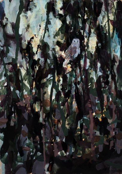 Jeg spenner opp bunkevis med akvarellark på plater og assosierer fritt. Lager ingen skisser. Heller på kaffe i forskjellige styrkegrader, gouache, farget blekk. Papiret sveller opp og trekker inn pigmentene -ujevnt og anarkistisk. Noen gjenkjennelige former oppstår og forsvinner. Lyst mot mørkt, opak mot transparent. I begynnelsen bommer jeg mye og kaster det meste. Det kan se ut som jeg treffer bedre hvis jeg ikke tenker motiv i det hele tatt, bare flate, strøk, farge. Jeg drar en vindusnal hardt gjennom halvtørr lavering. Det likner da noe -er det sol mellom graner? Med litt flaks kan den flekken på midten der bli ei ugle. La den tørke til i morgen. Begynne på et nytt. Hele tiden minne meg selv på å holde den forfengelige ambisjonen nede.